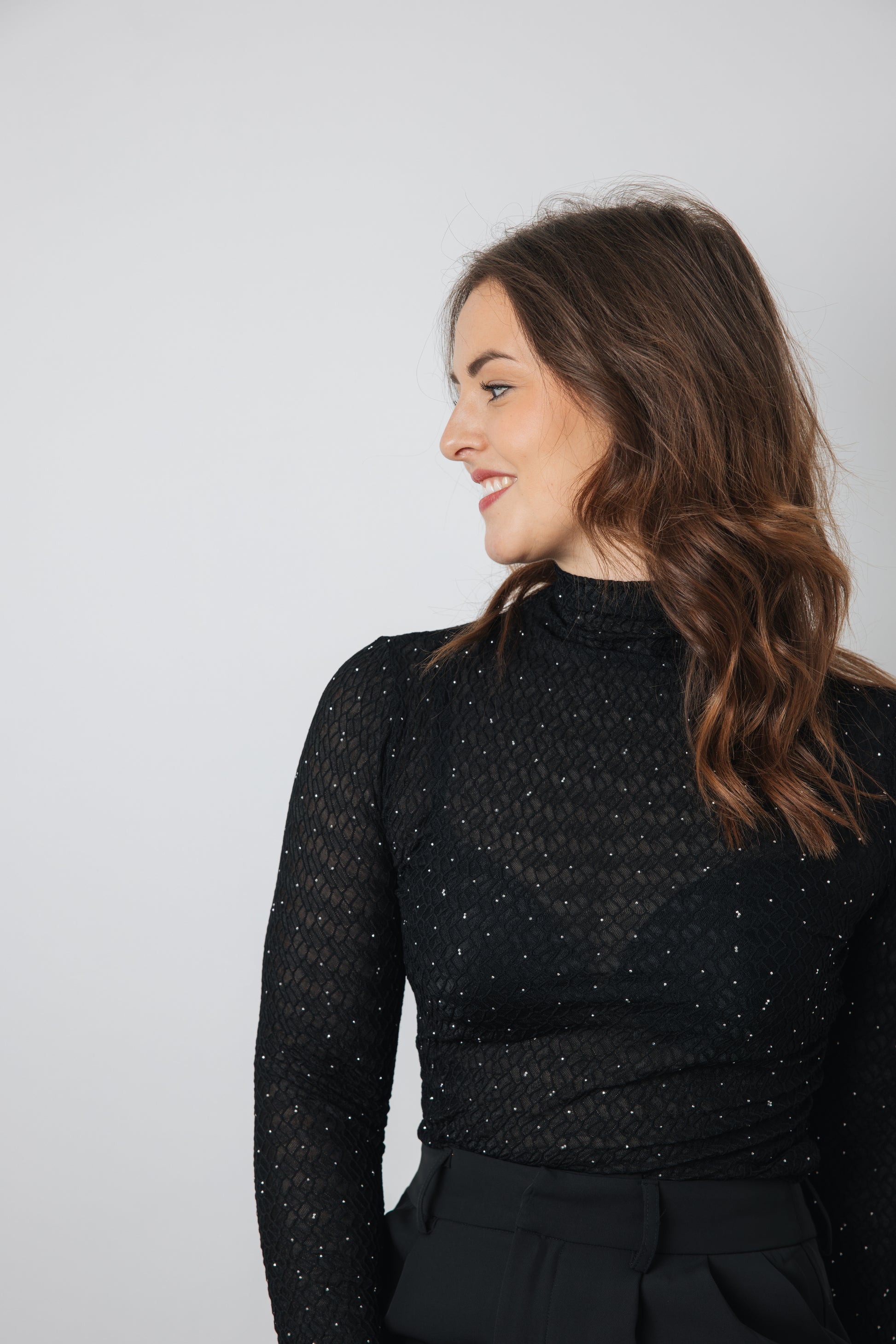 Une blouse élégante qui allie transparence délicate et éclat subtil. Son col légèrement montant et sa coupe près du corps apportent une allure sophistiquée, tandis que son tissus finement ajouré est parsemé de petits strass. Portée avec un pantalon taille haute, c'est la pièce idéale pour les fêtes!