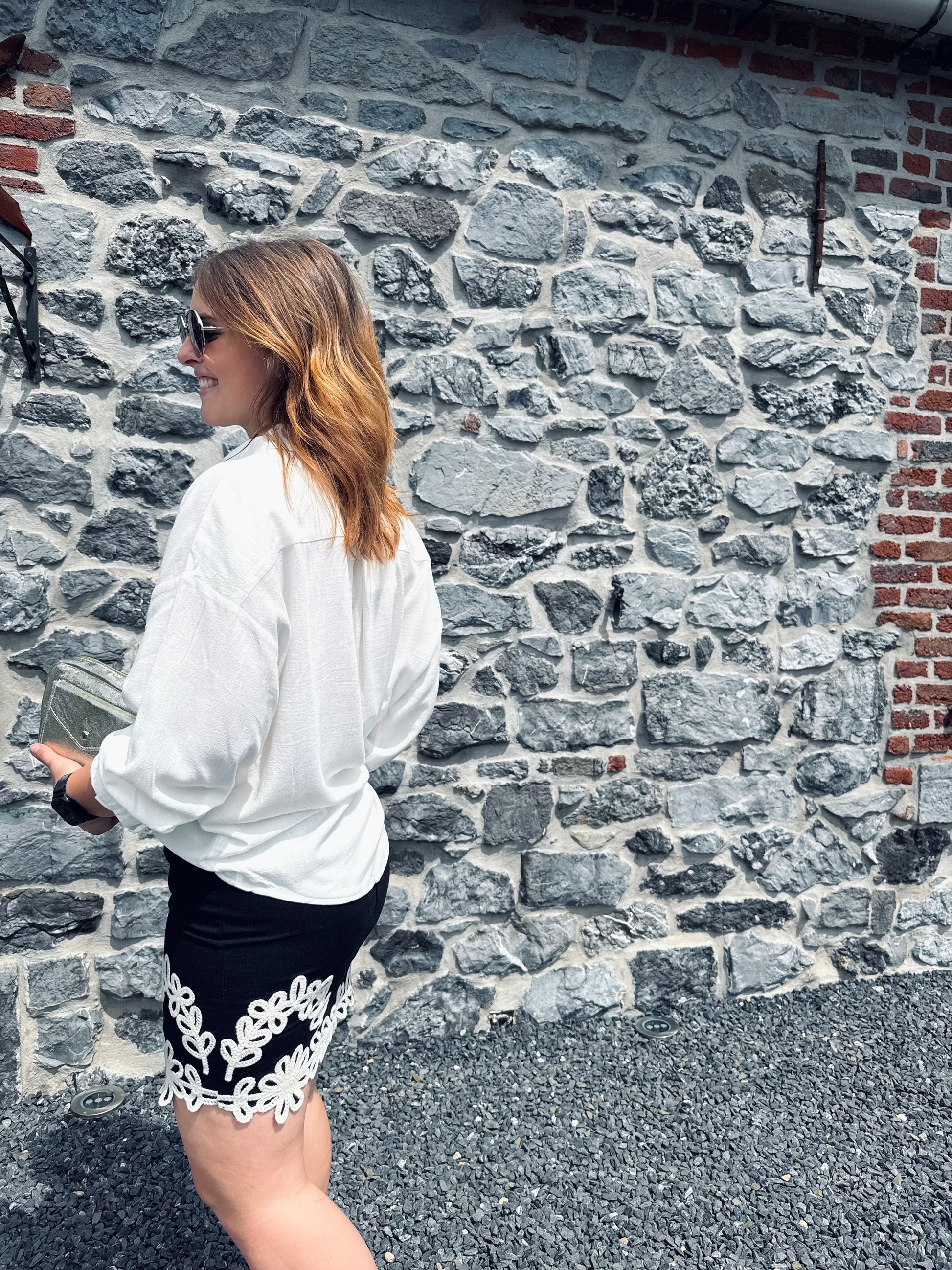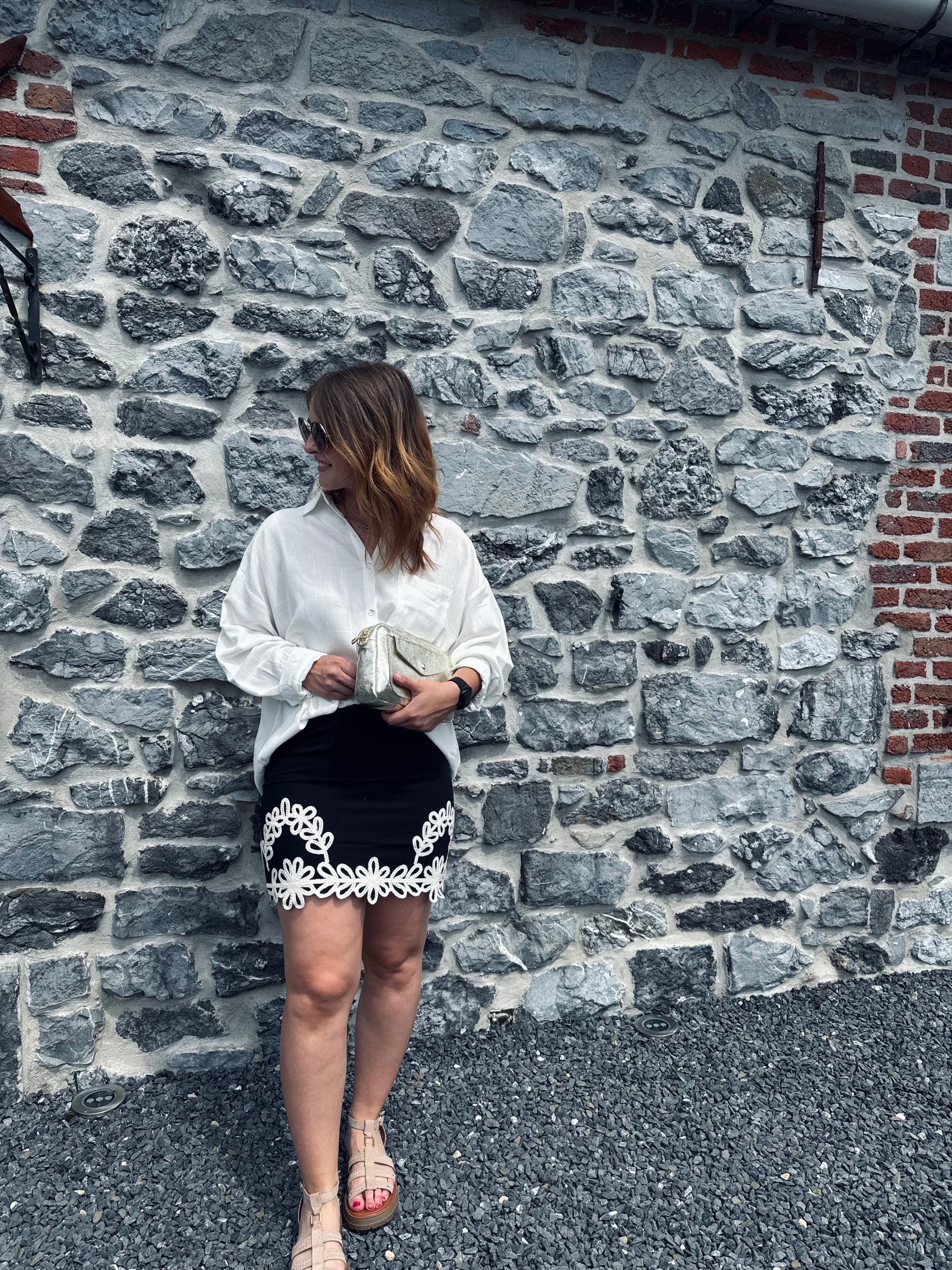 La chemise Lina est présentée avec la jupe Ambre et les sandales Monia.