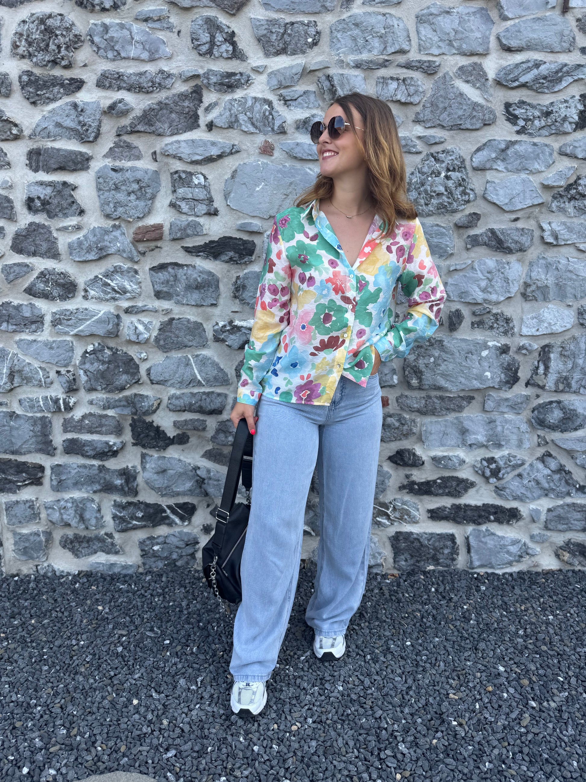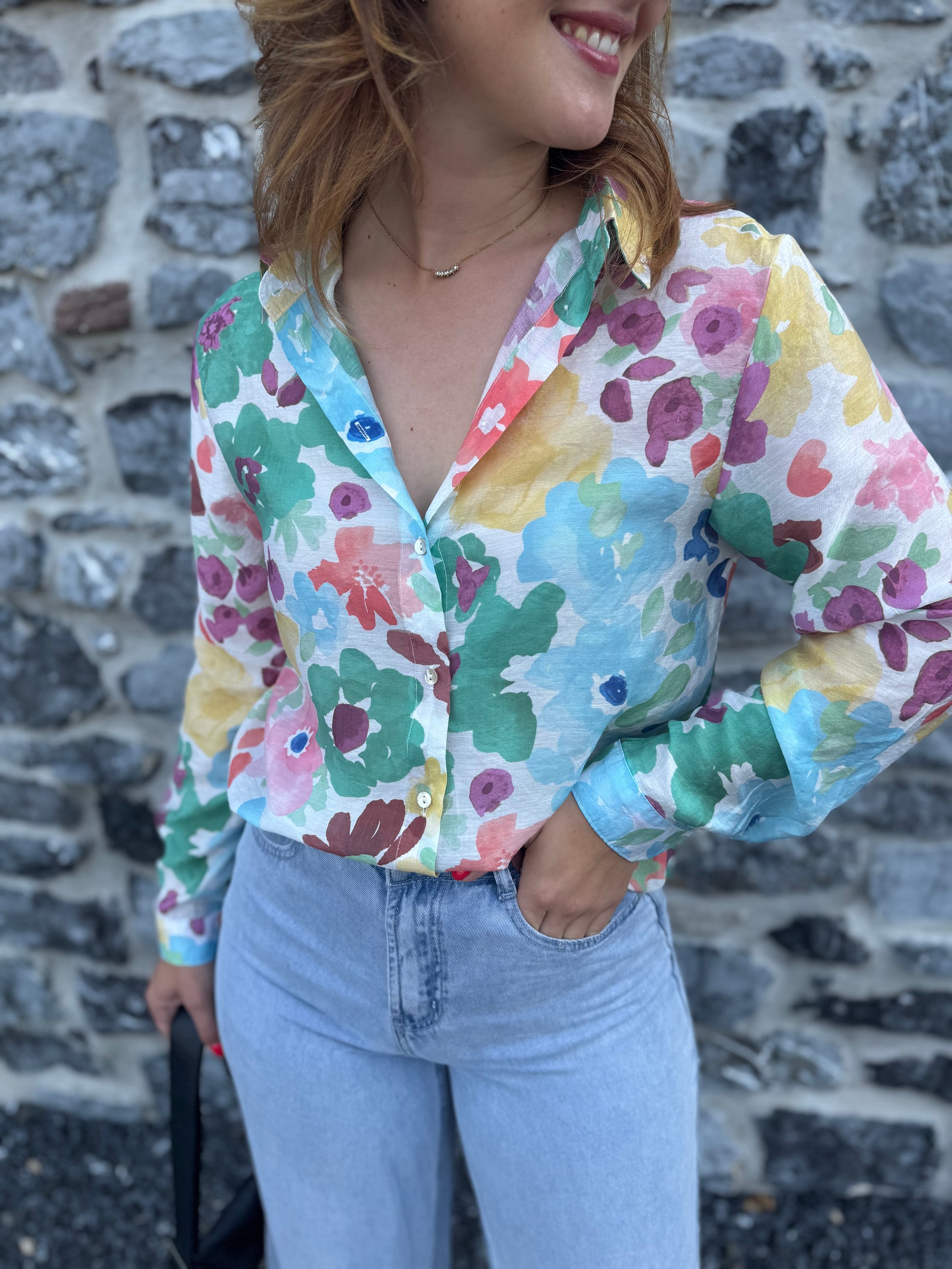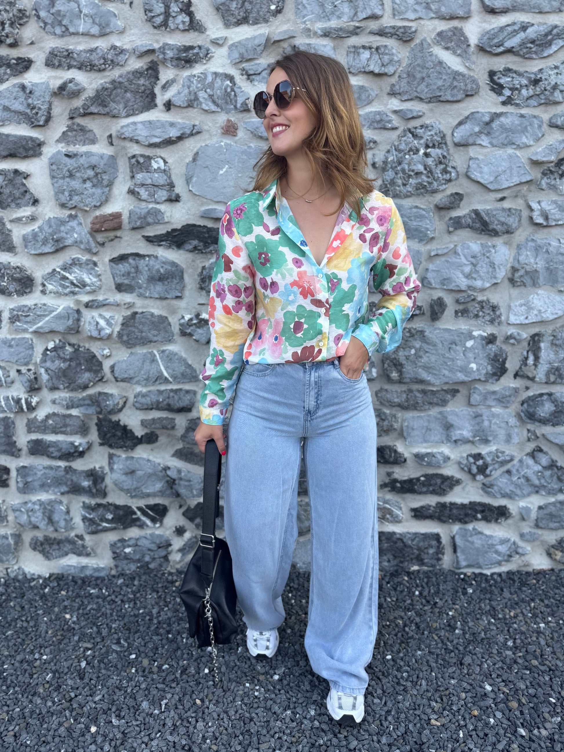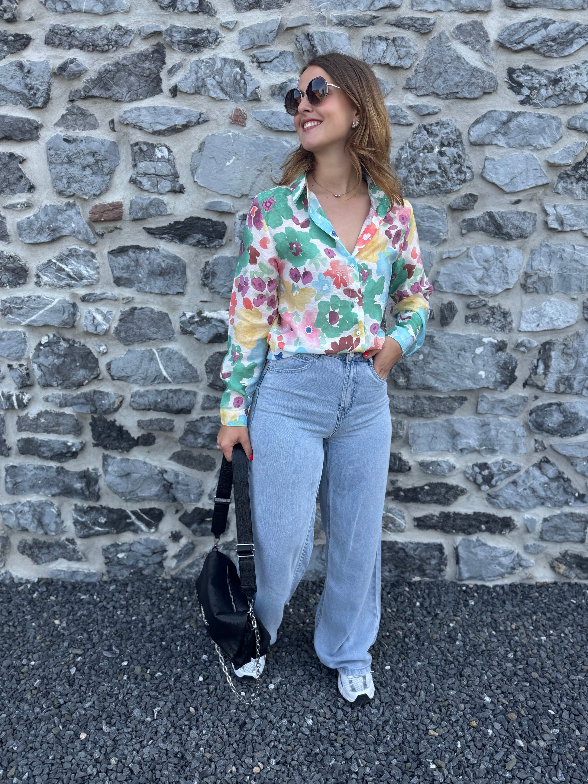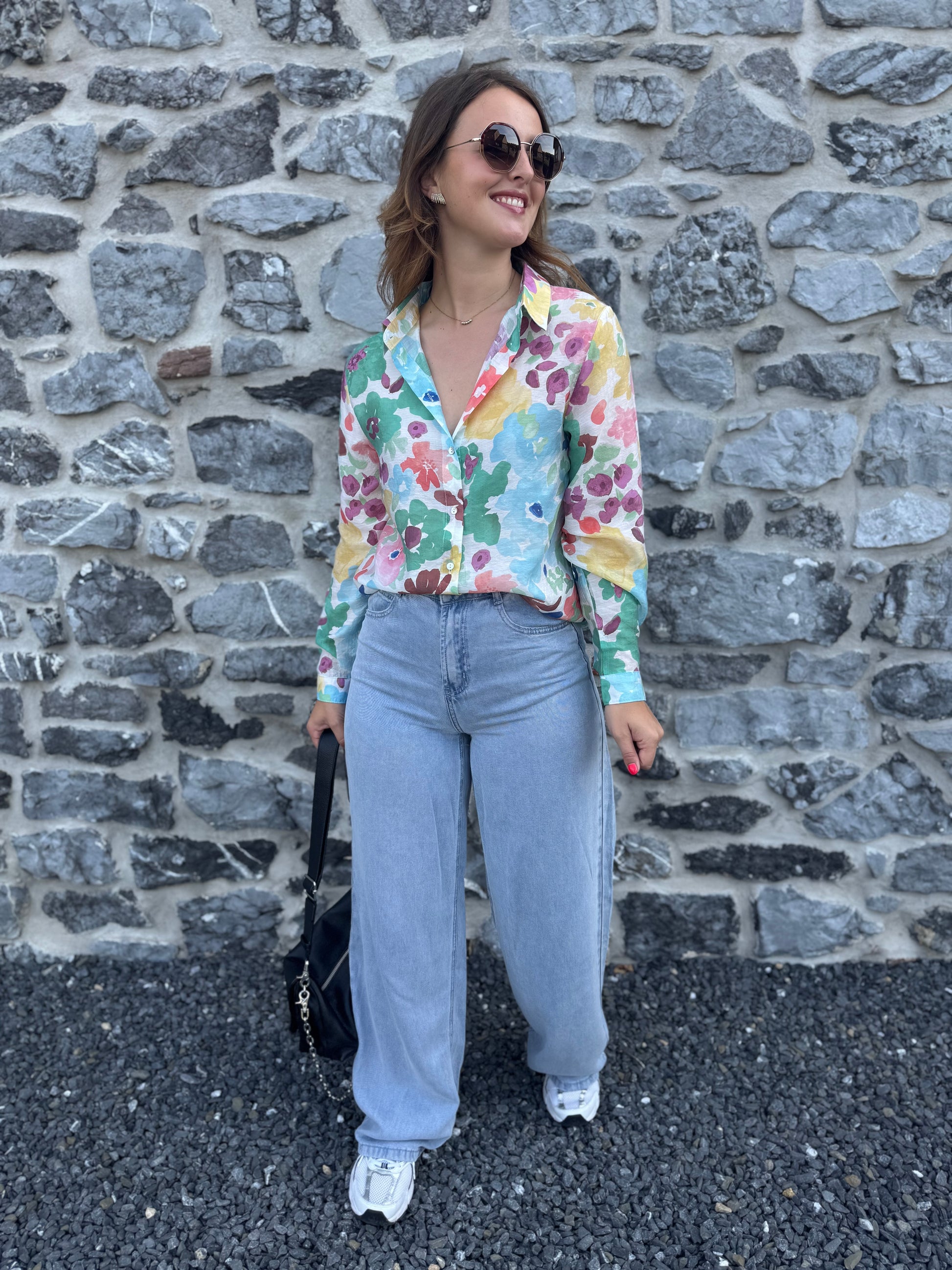 Le chemisier Charlie est présenté avec le pantalon Lyam.