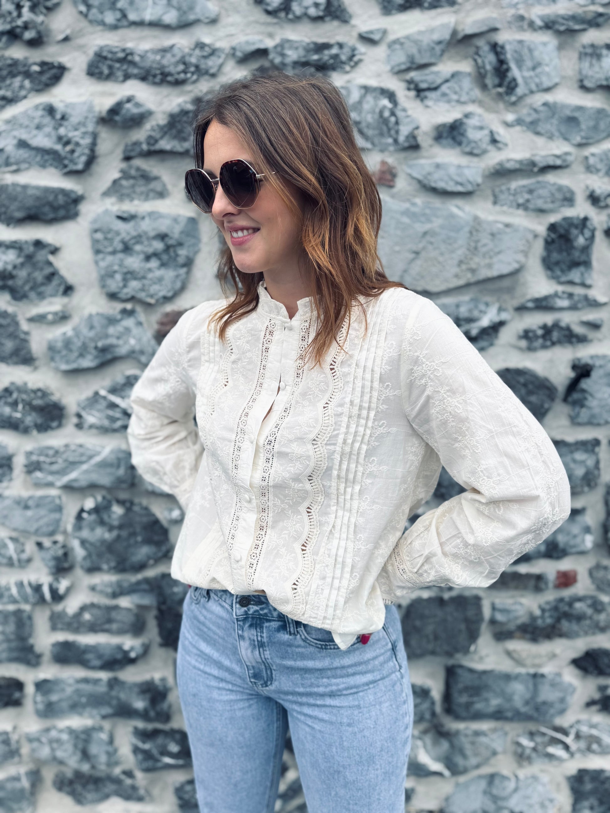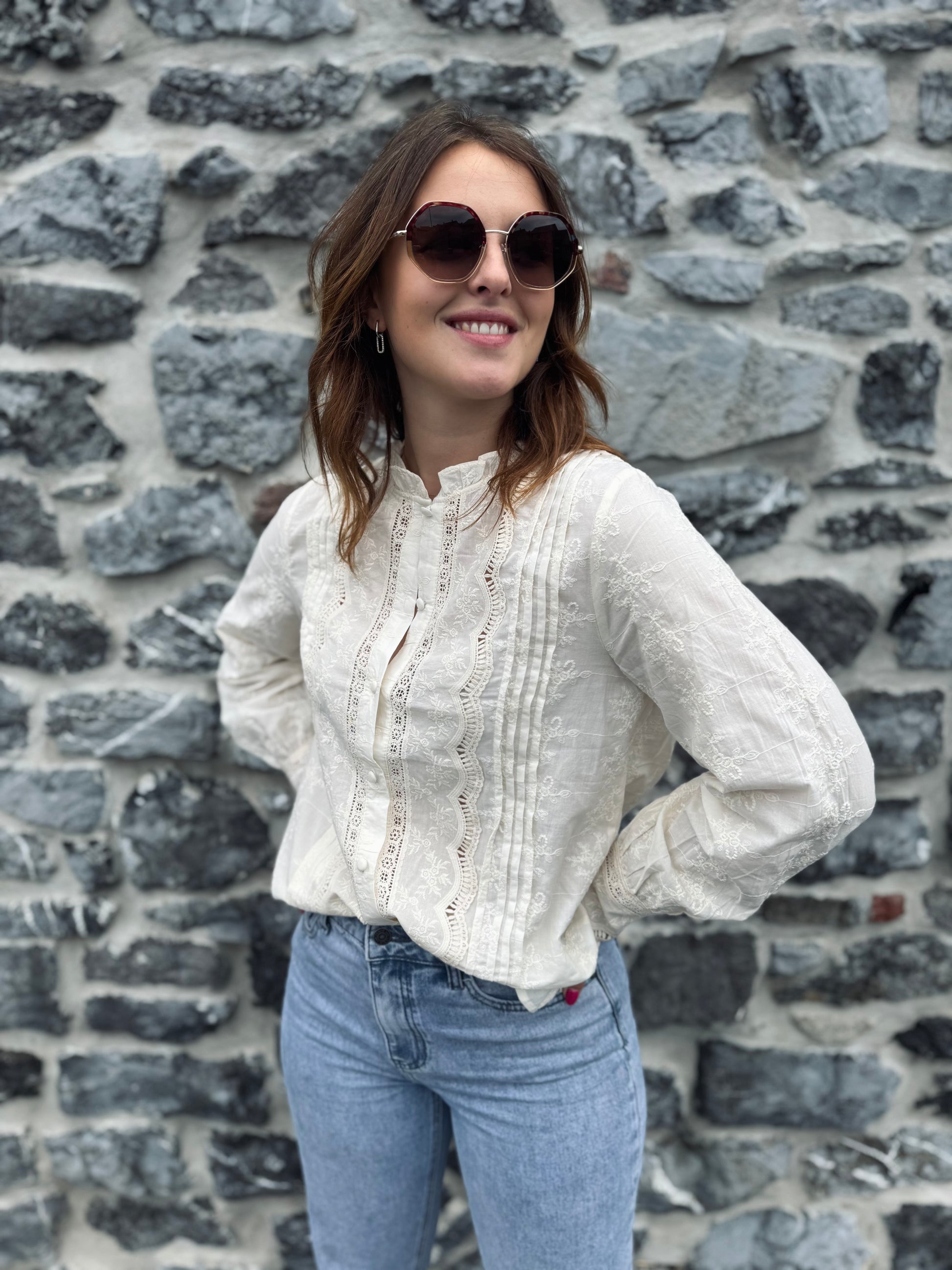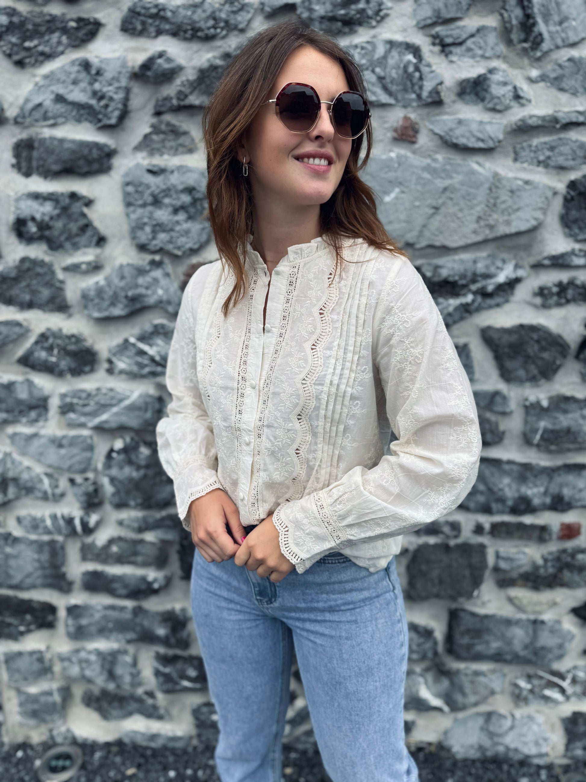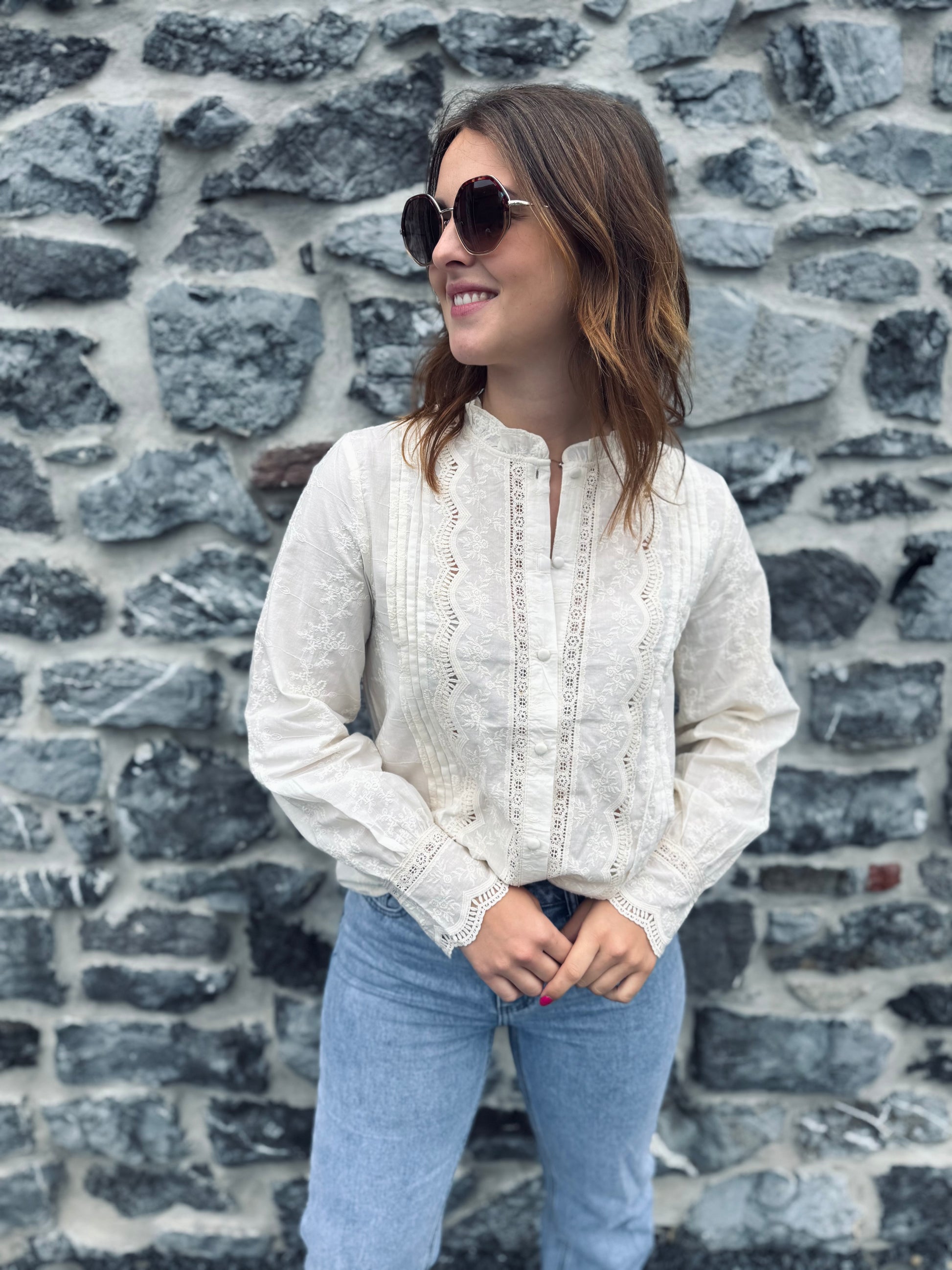 - Chemisier beige avec dentelle et broderie
