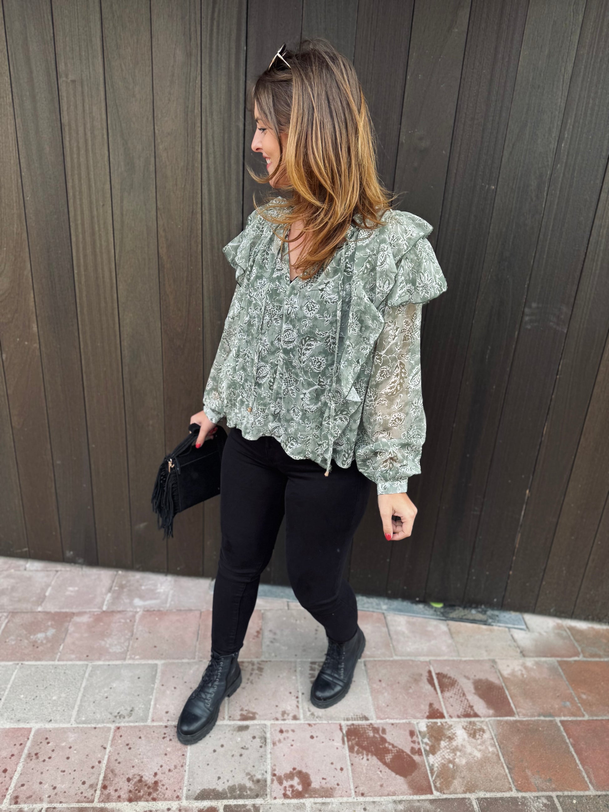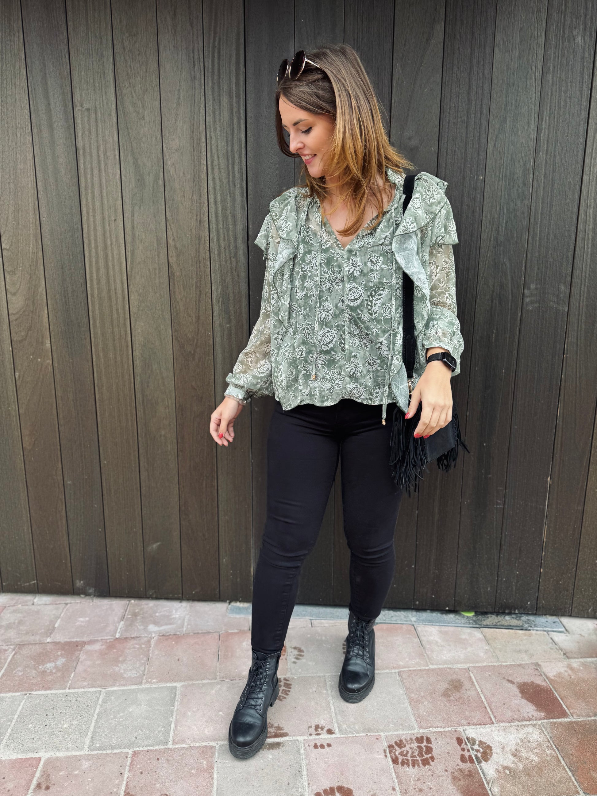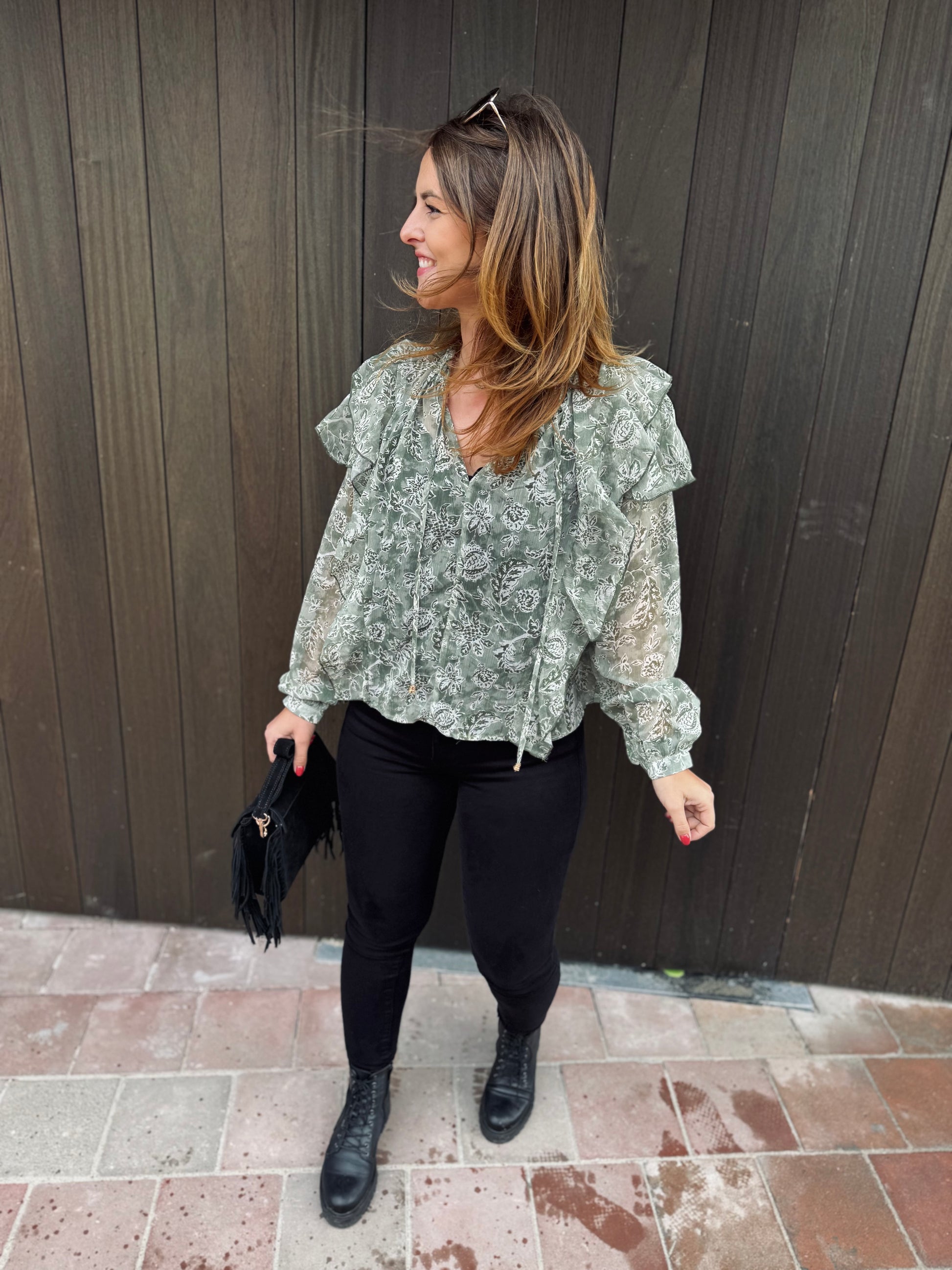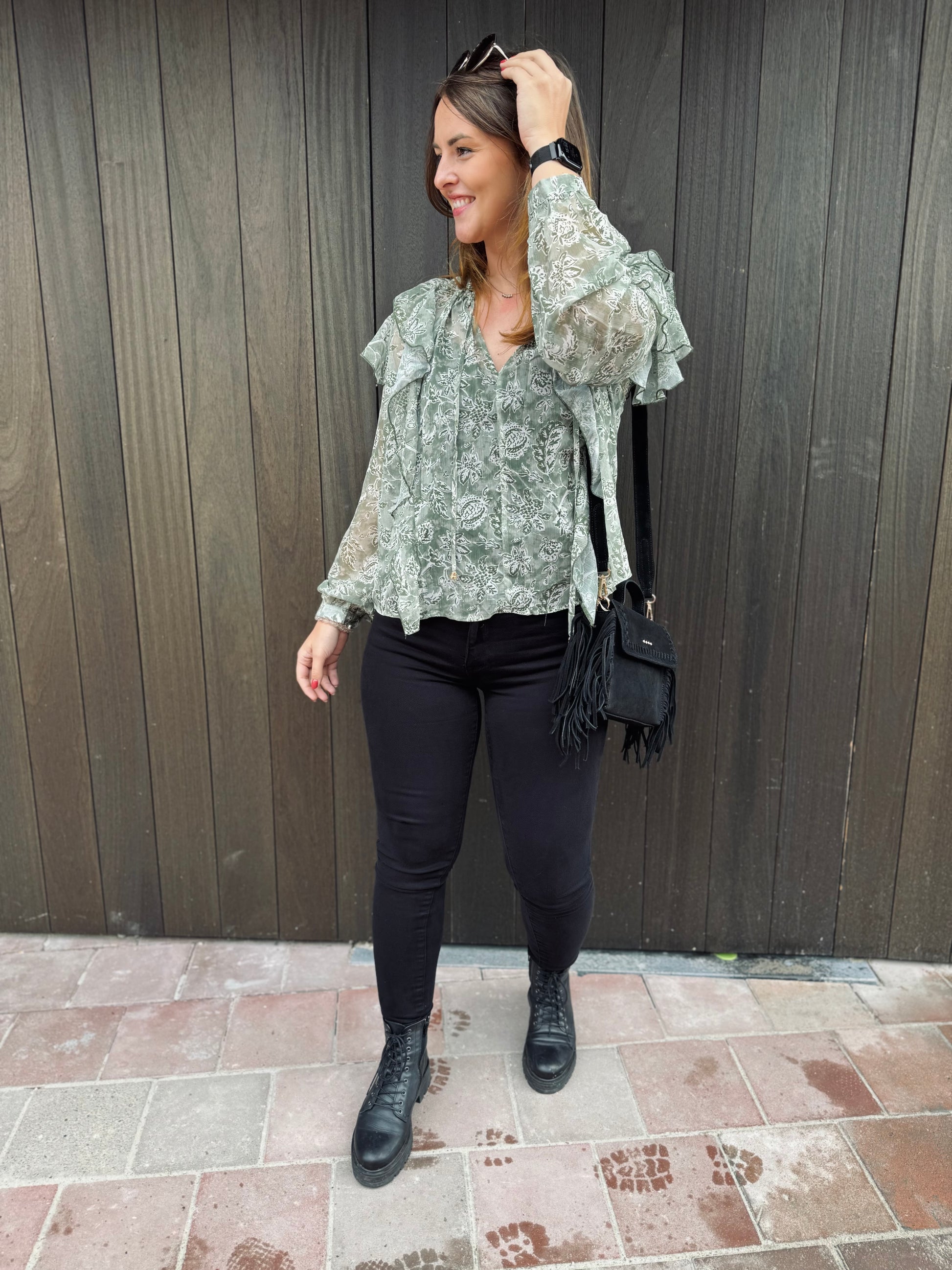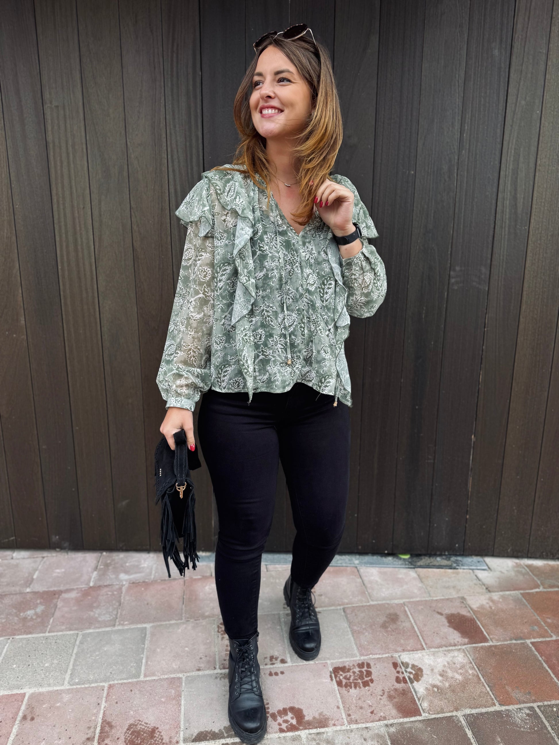 Le chemisier Paola est présenté avec le jeans Nola.