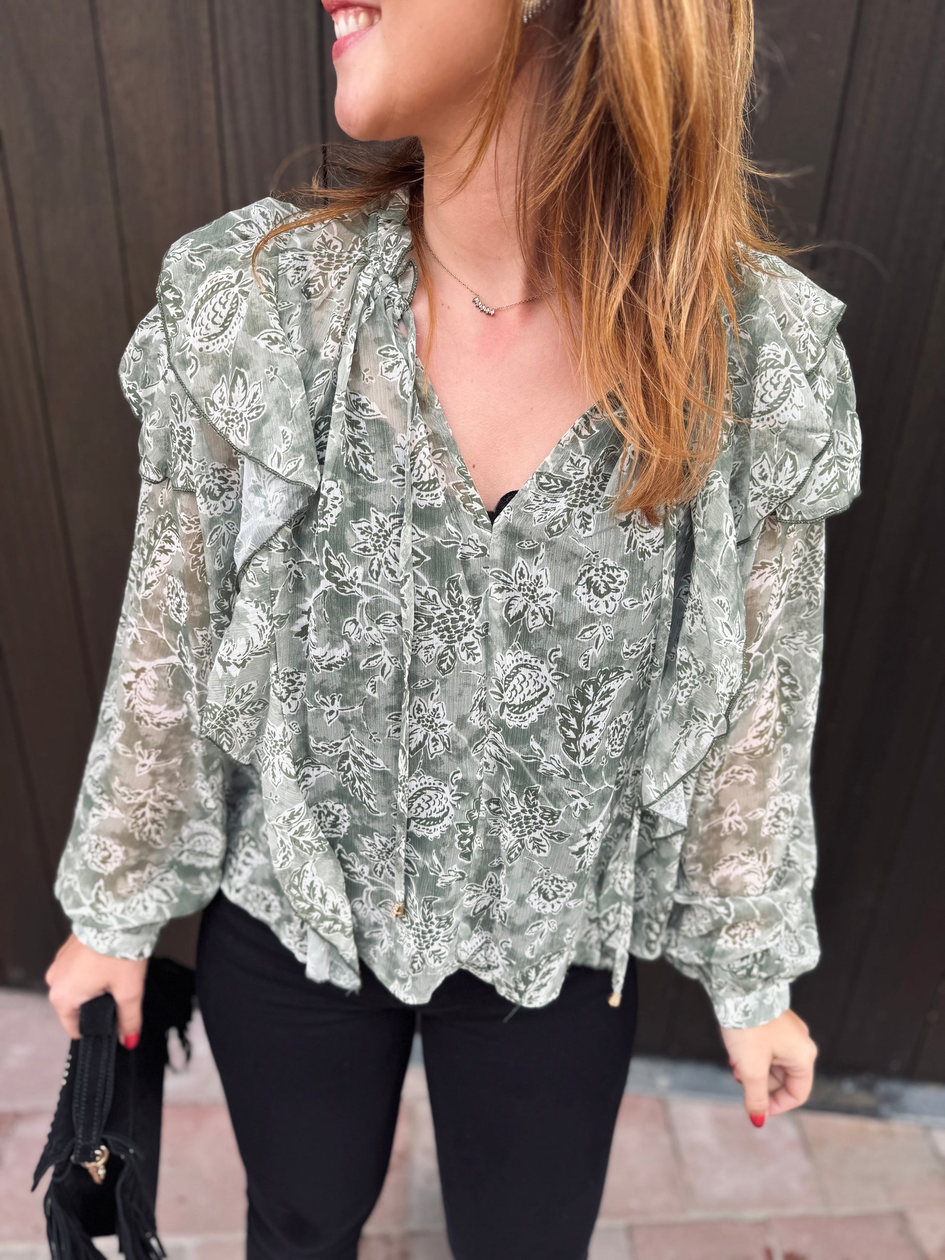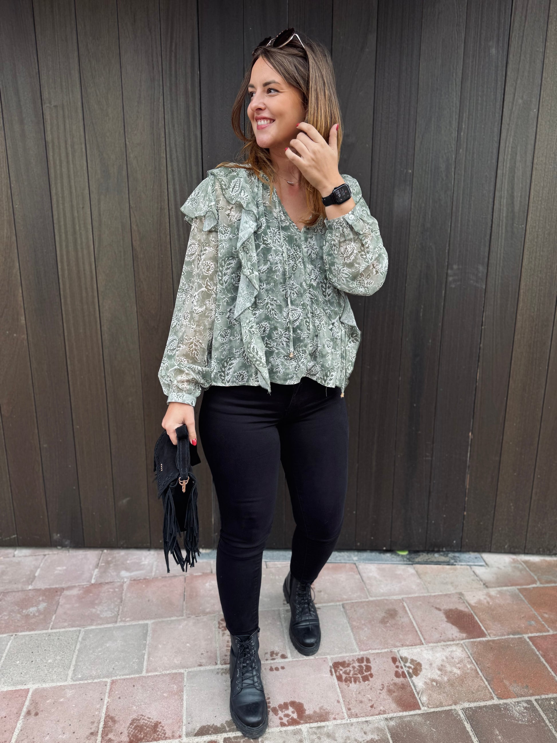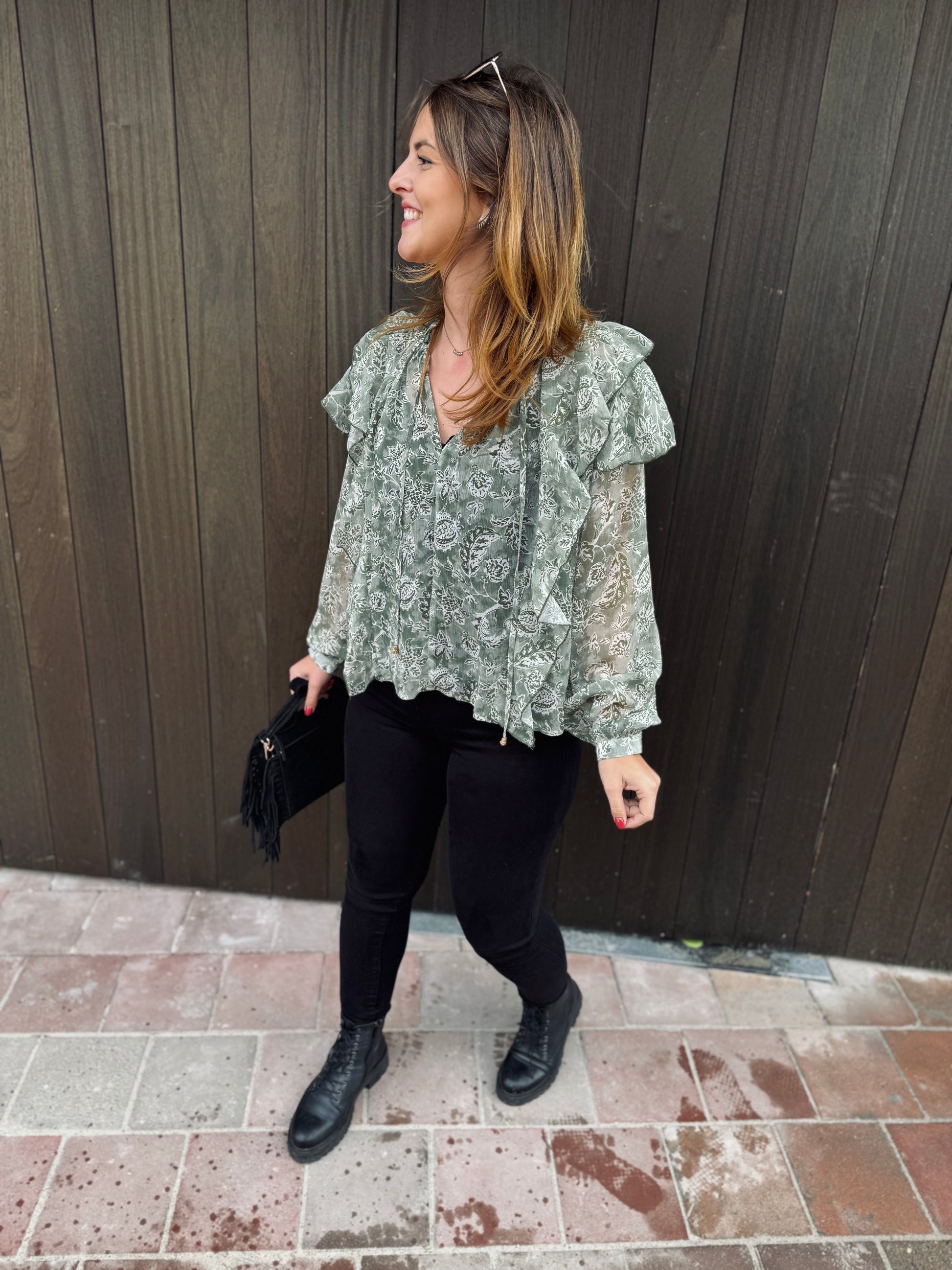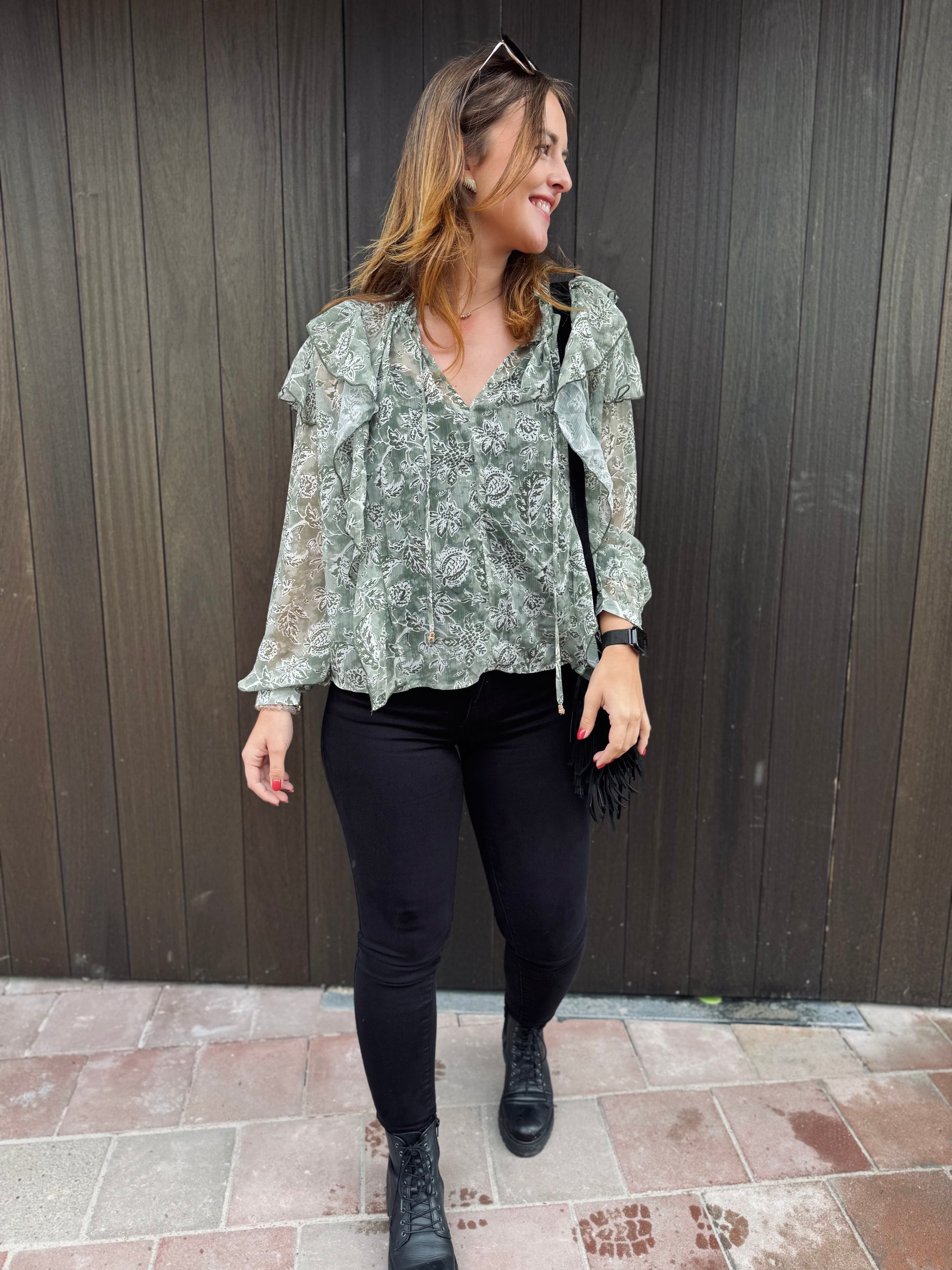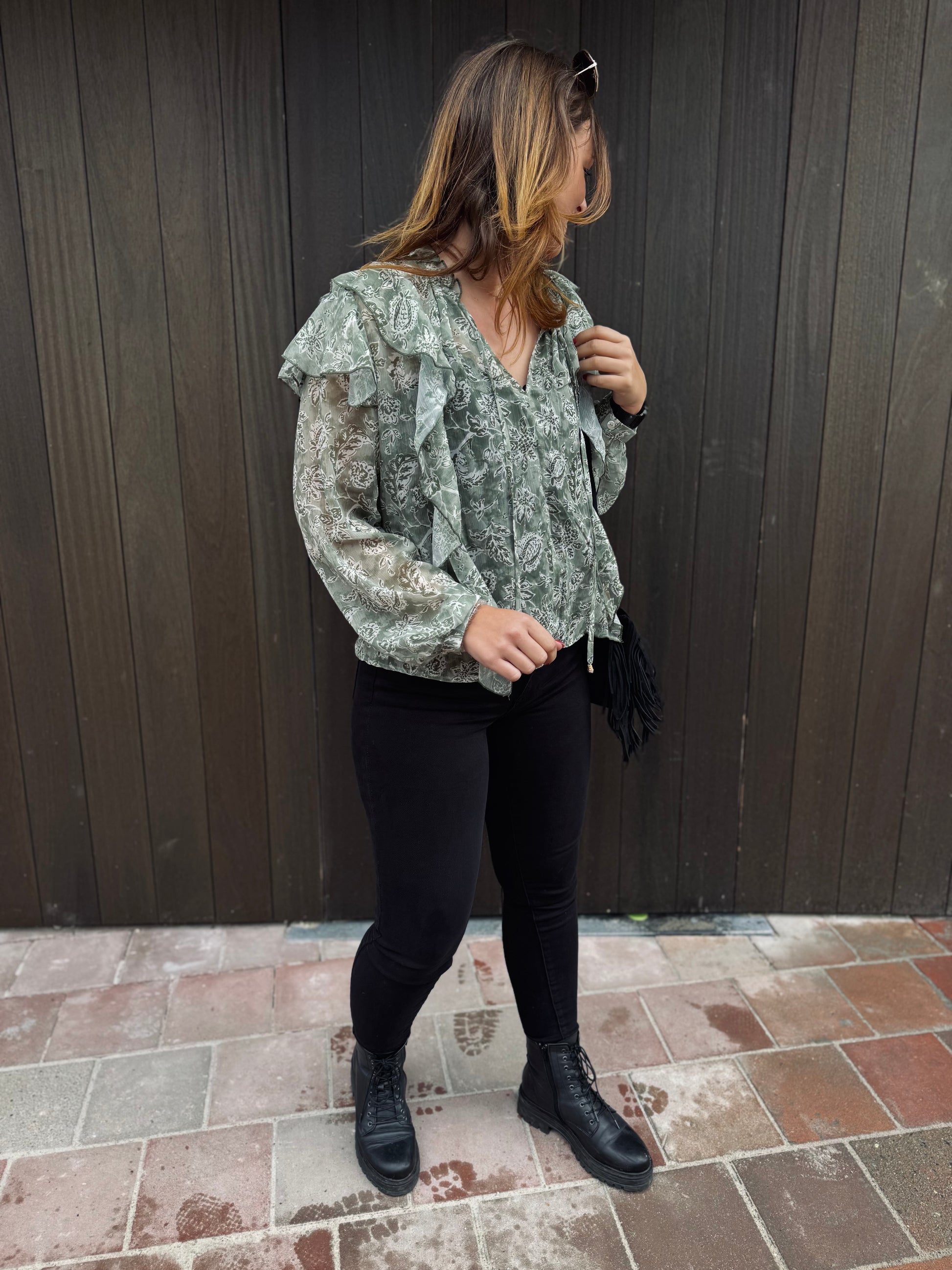 Le chemisier Paola est présenté avec le jeans Nola.