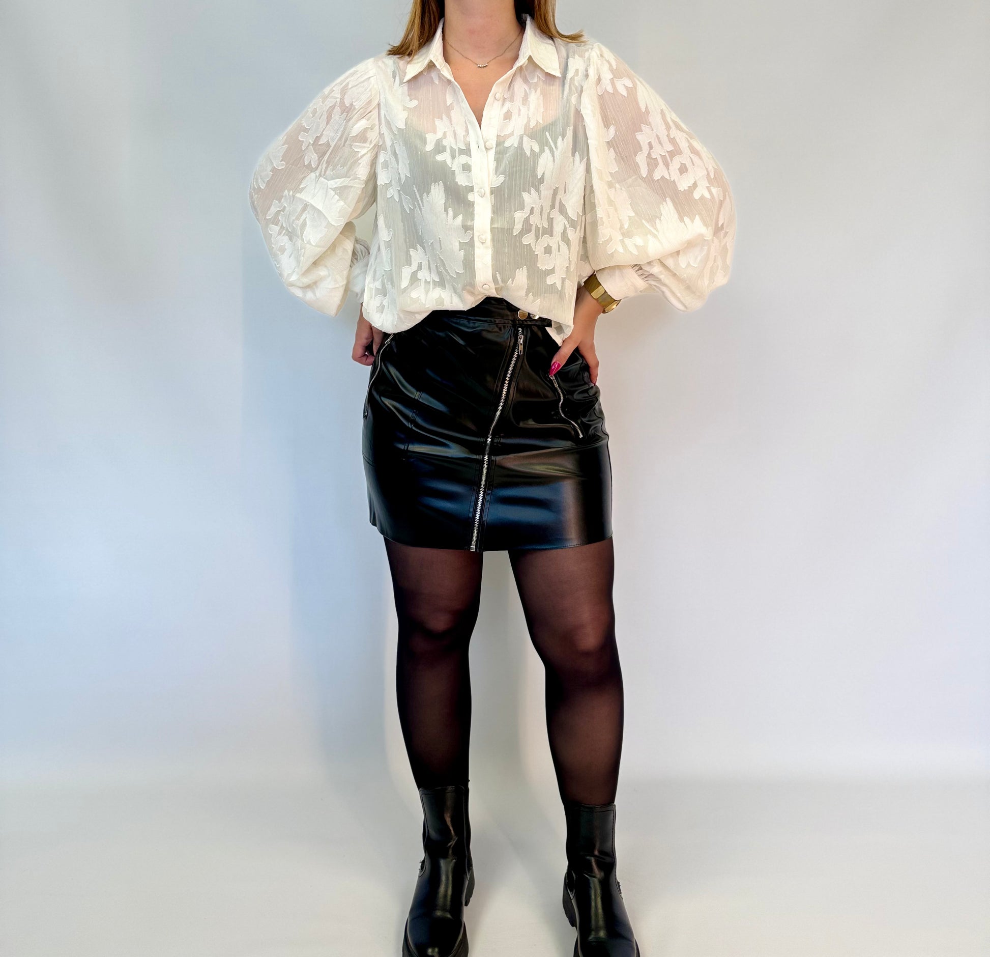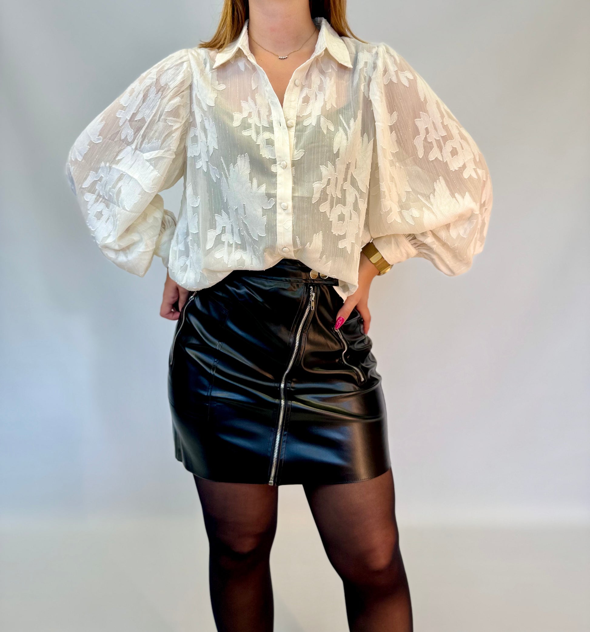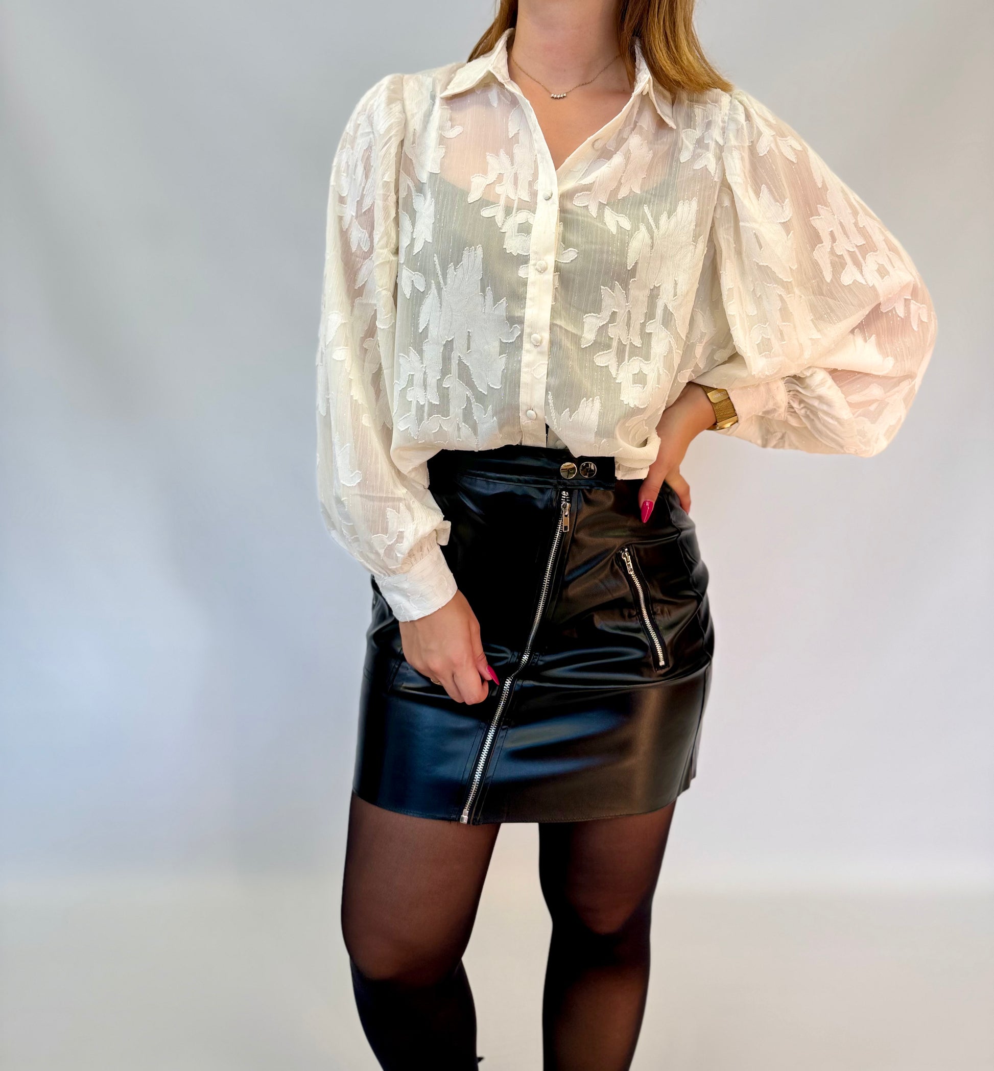 - Le chemisier plume est présenté avec la jupe Laly