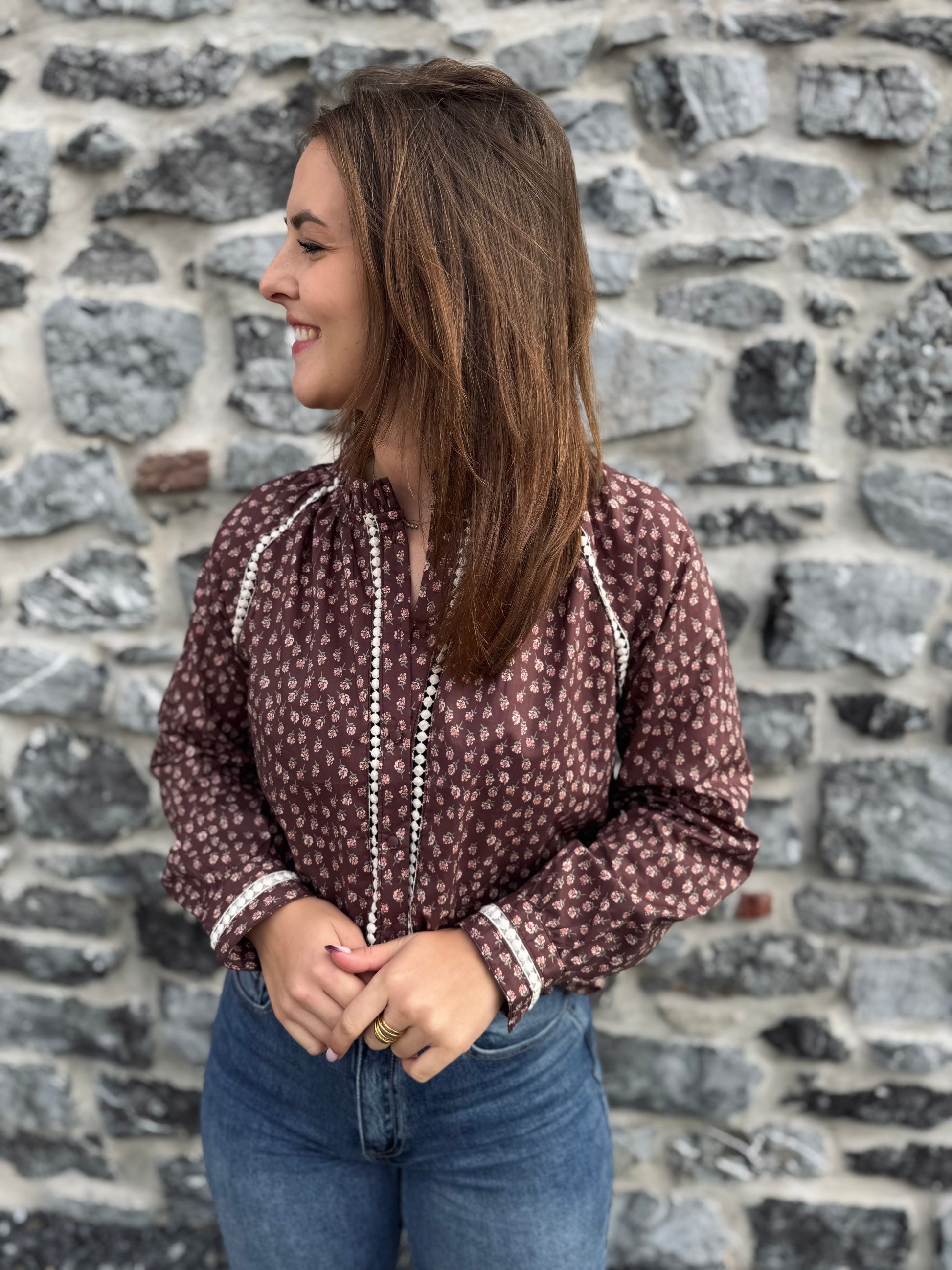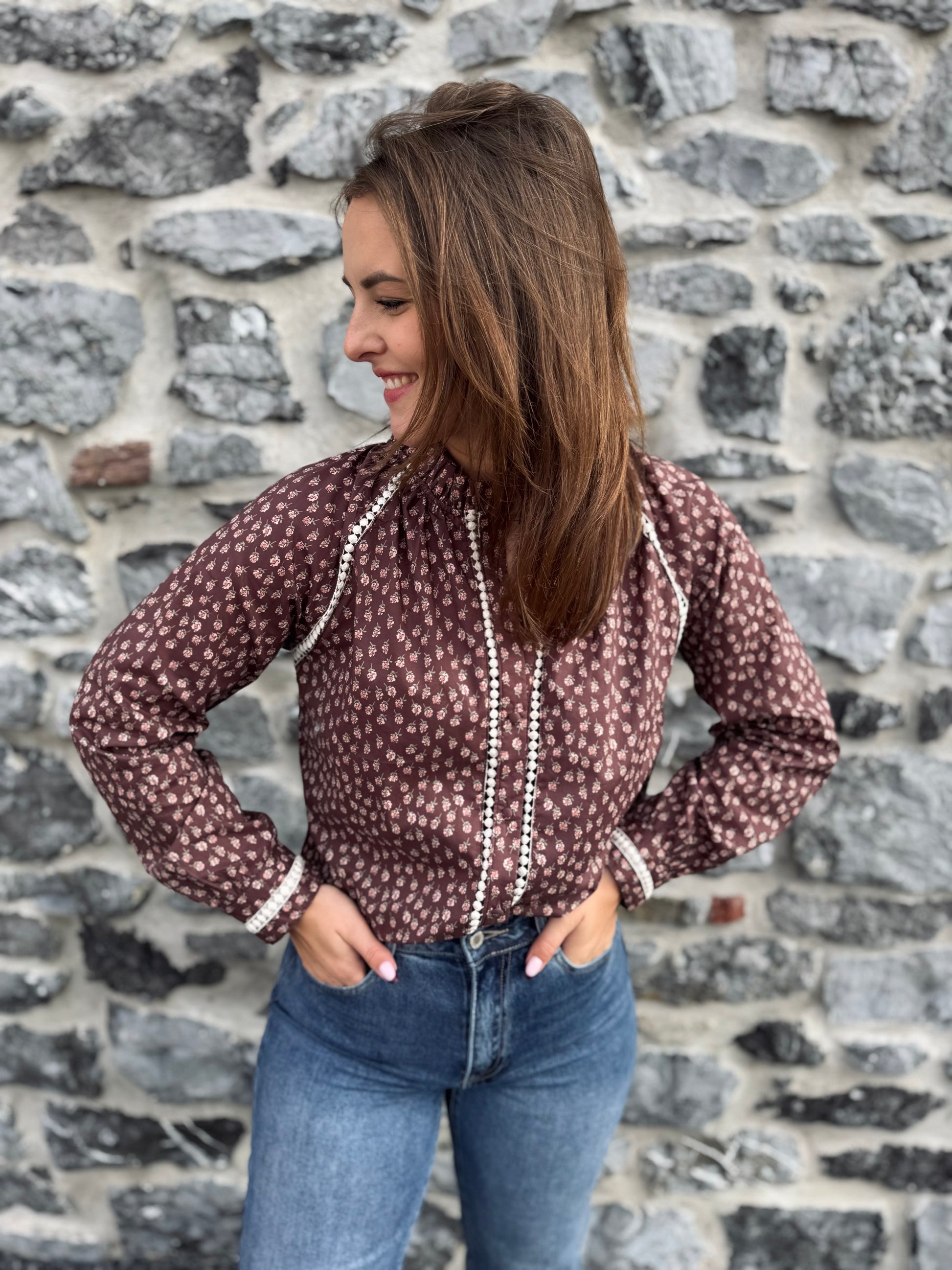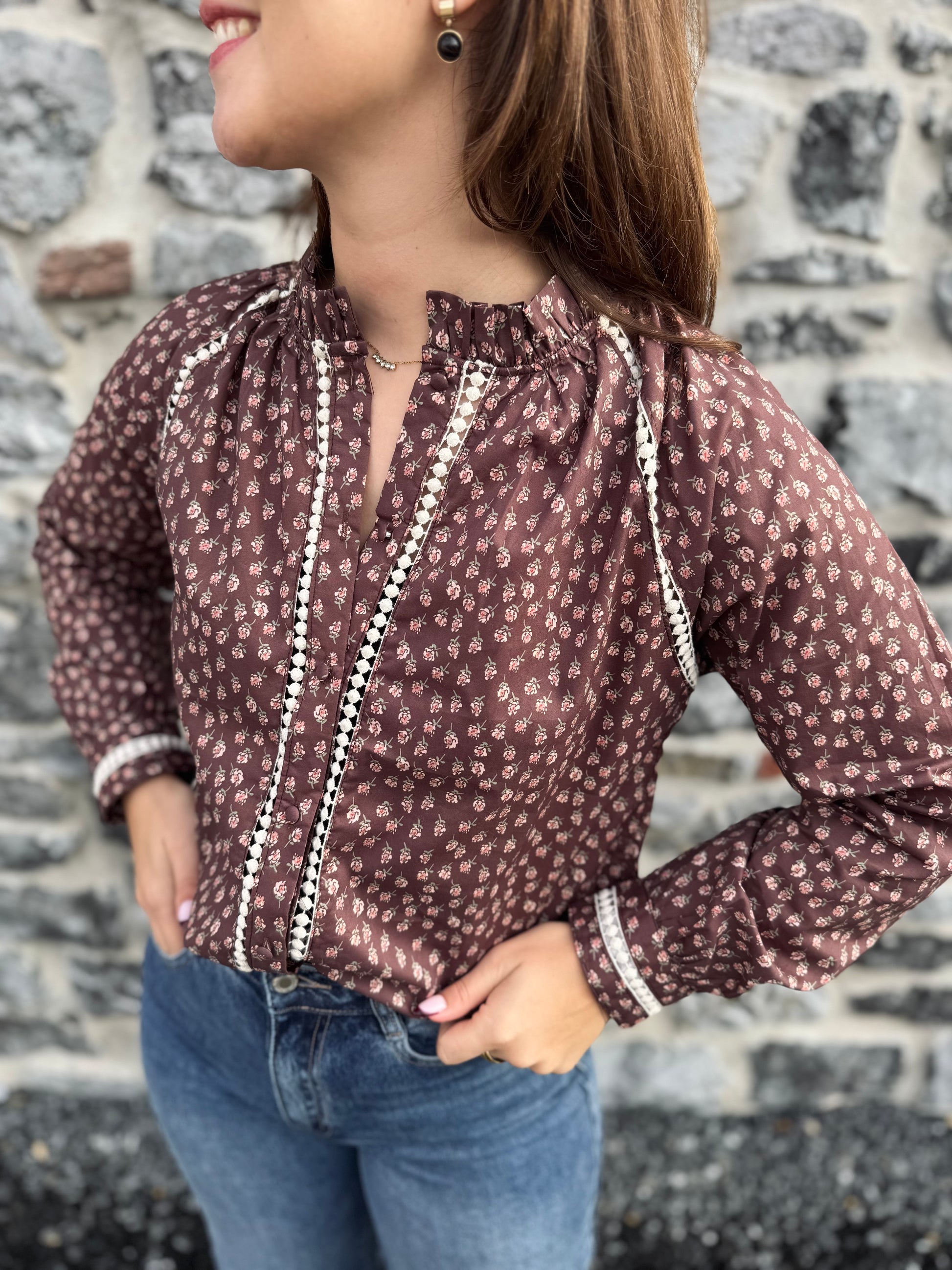 - Chemisier marron avec des motifs fleuris