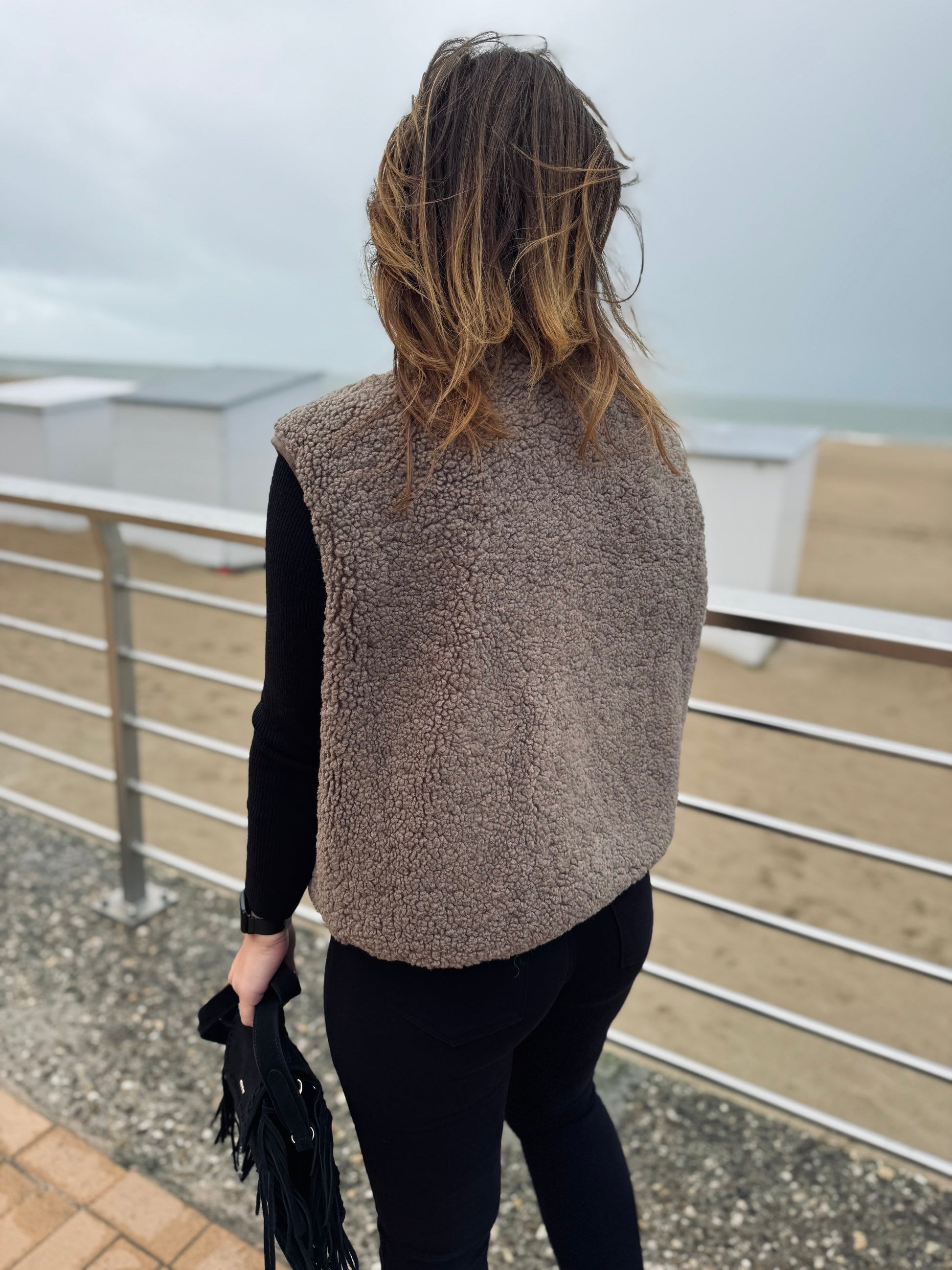 Le gilet Lino est présenté avec le pull Célio et le jeans Nola.
