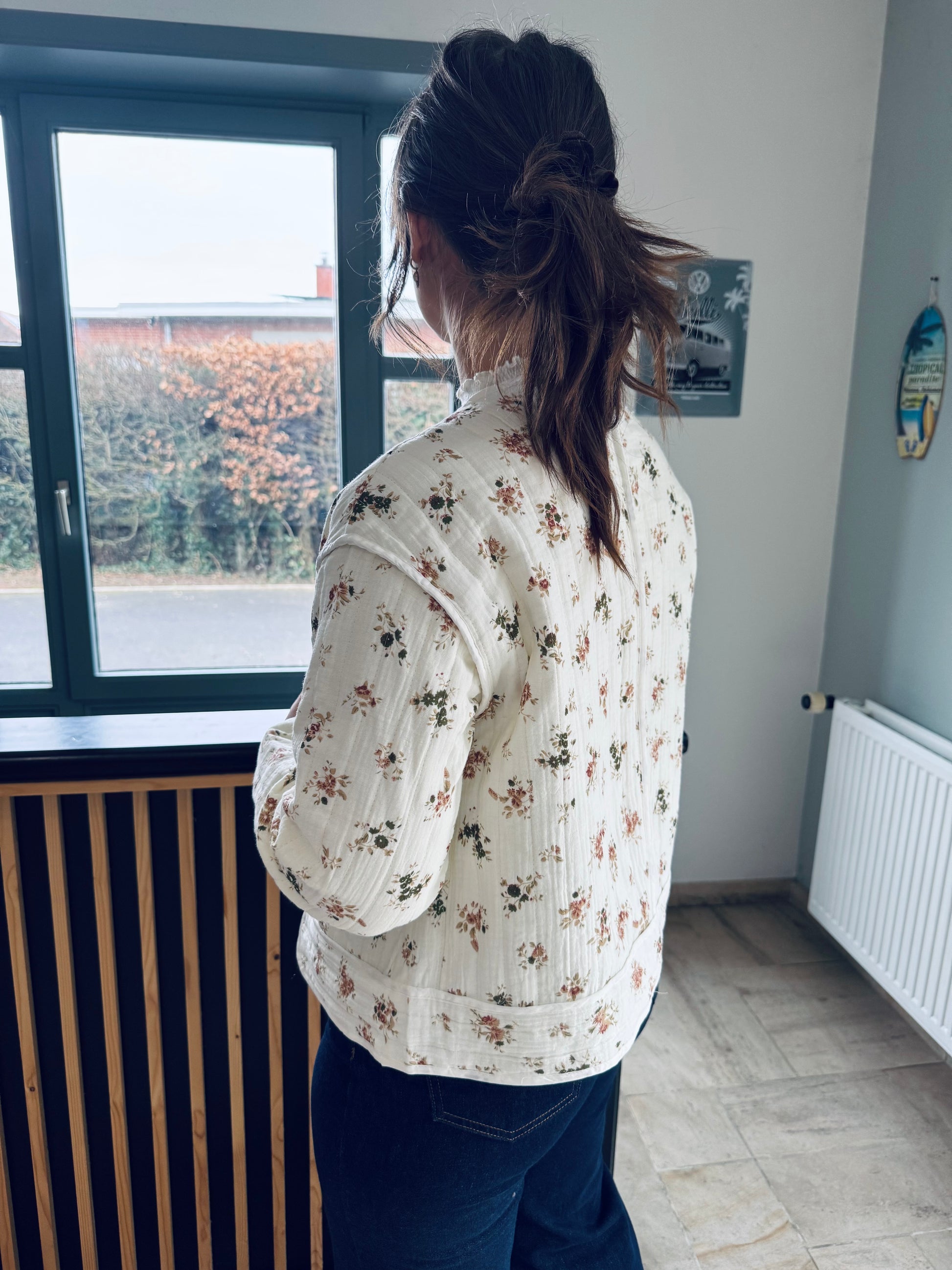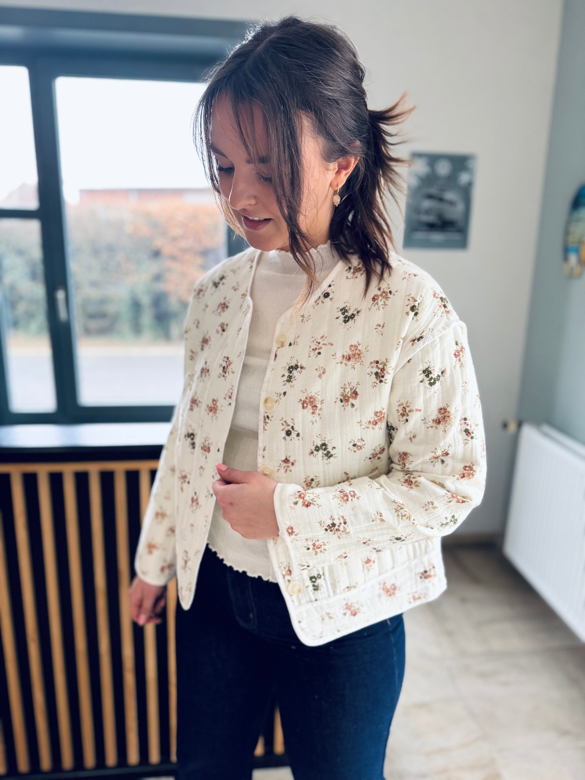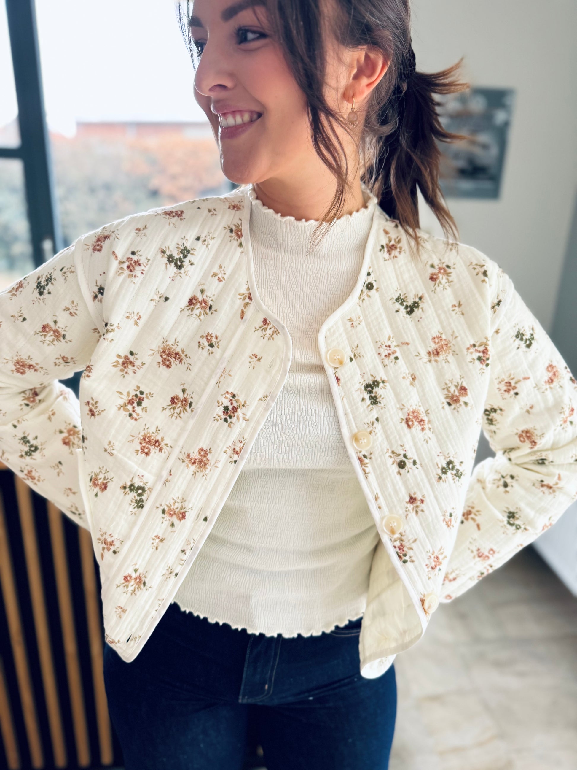 On craque pour cette veste légèrement matelassée écrue à imprimé fleuri, parfaite pour ajouter une touche douce à vos tenues du quotidien. On adore sa coupe facile à porter, ses jolis boutons et son style à la fois casual et élégant.