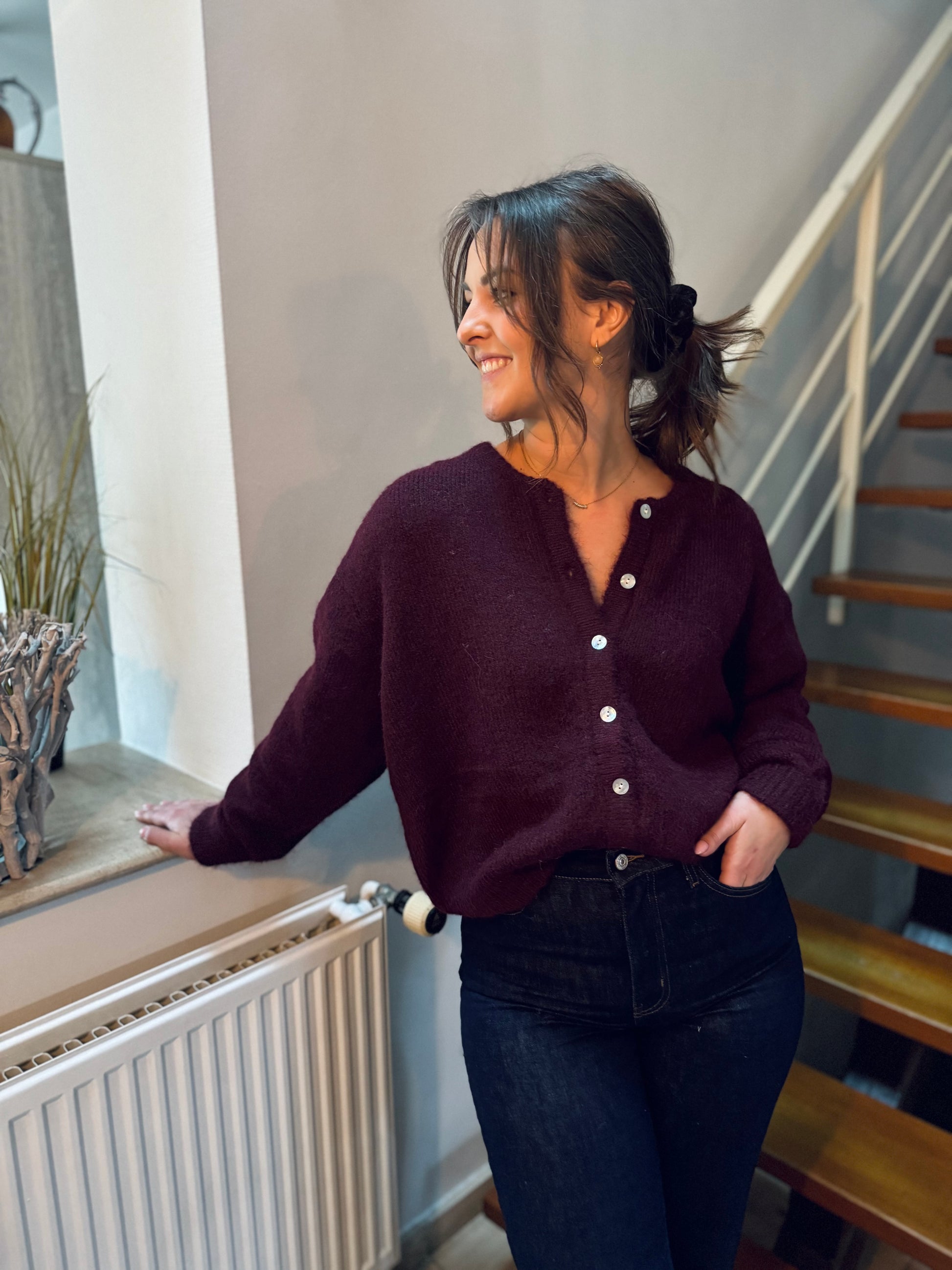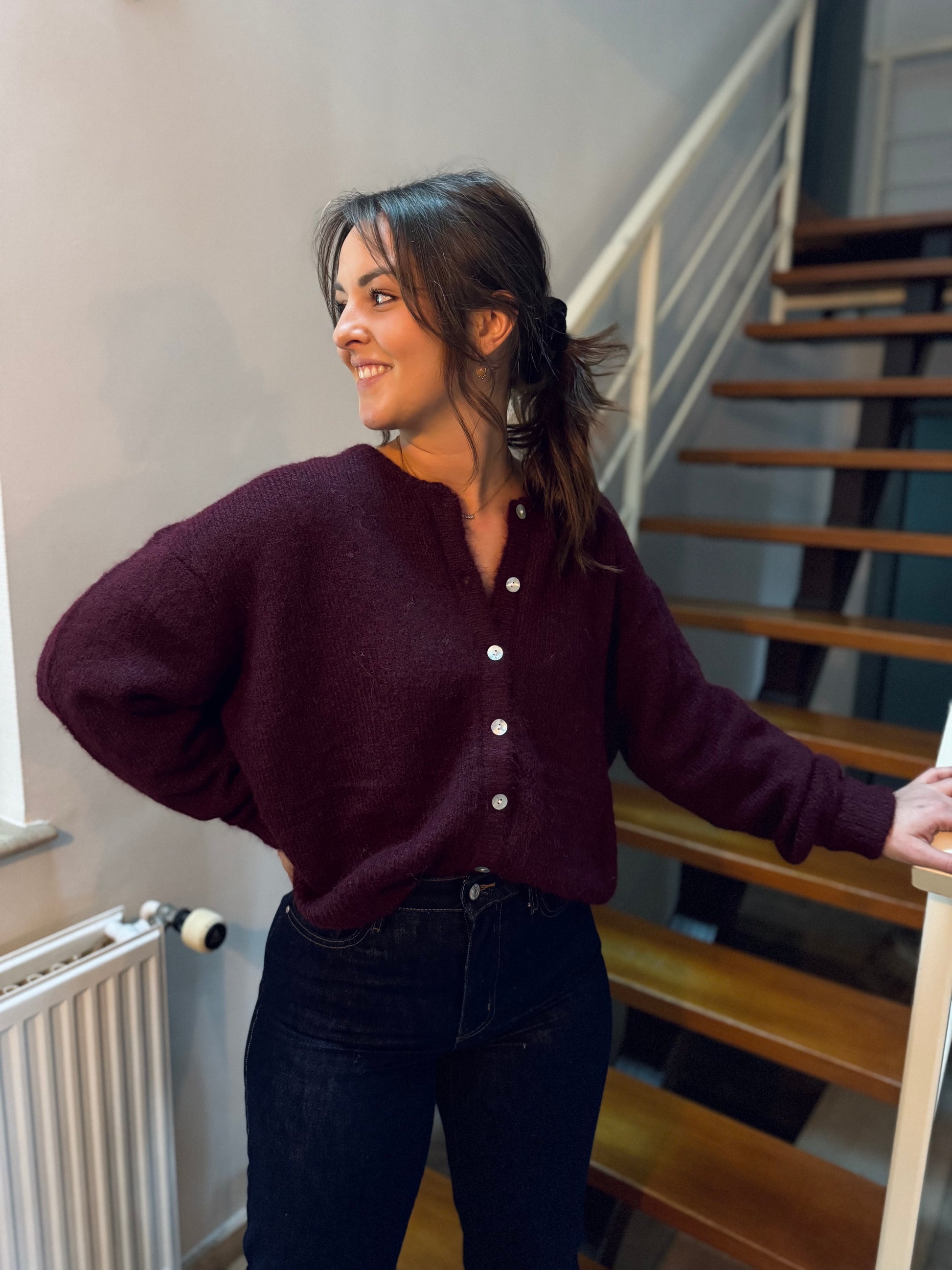 Apporte une touche chic et cocooning à tes looks avec ce gilet bordeaux ultra doux et agréable à porter. On adore sa coupe légèrement loose.