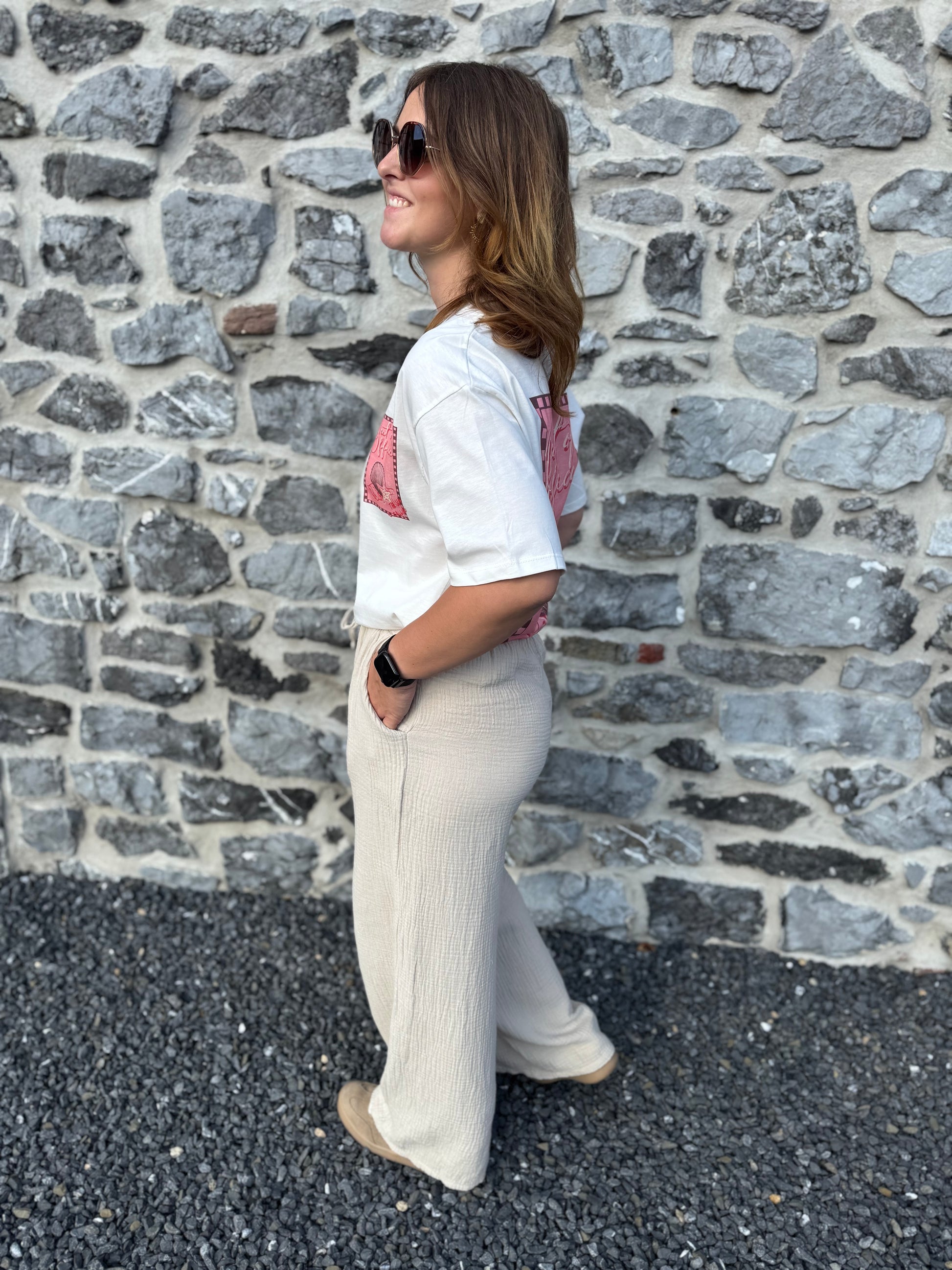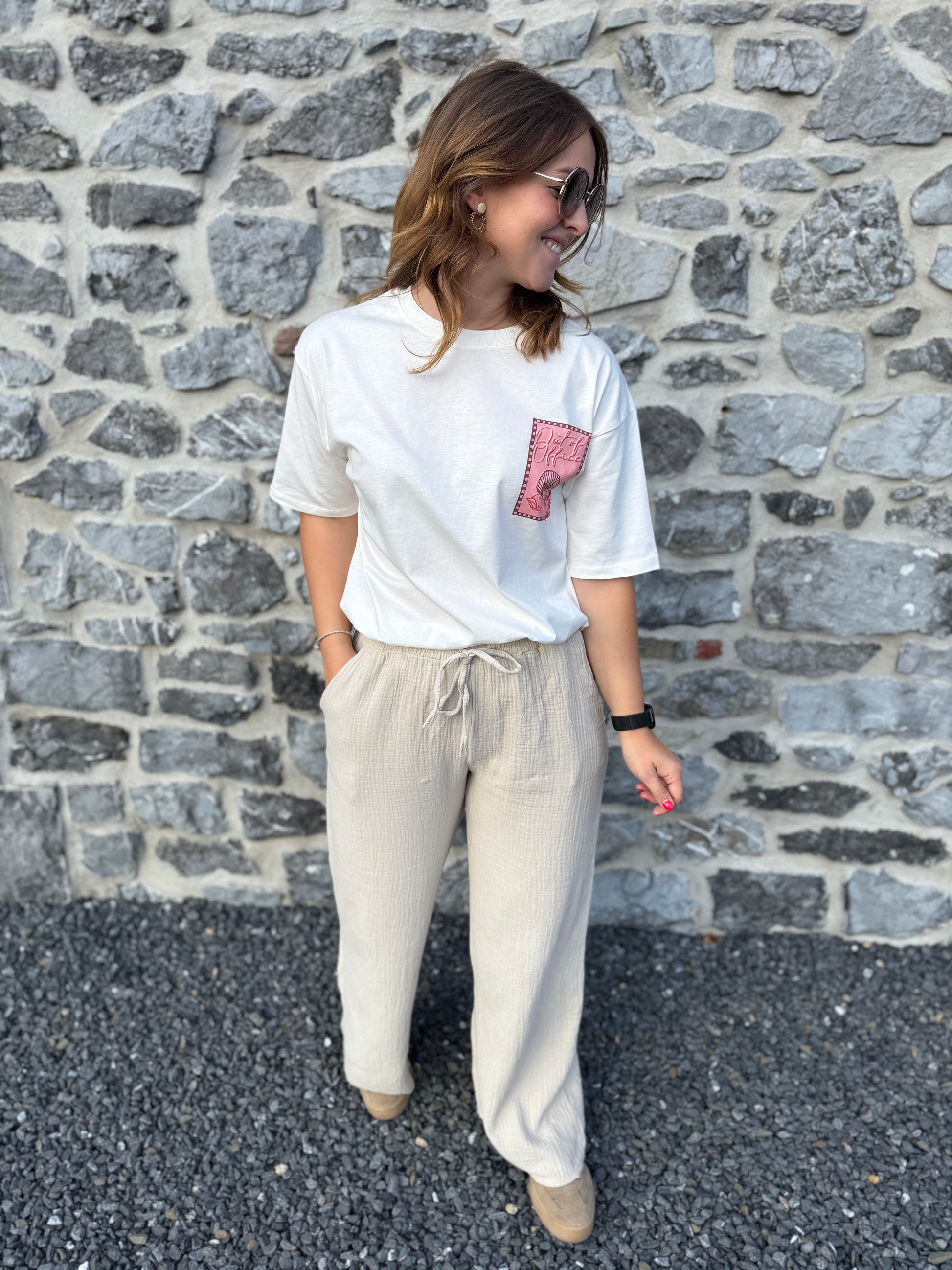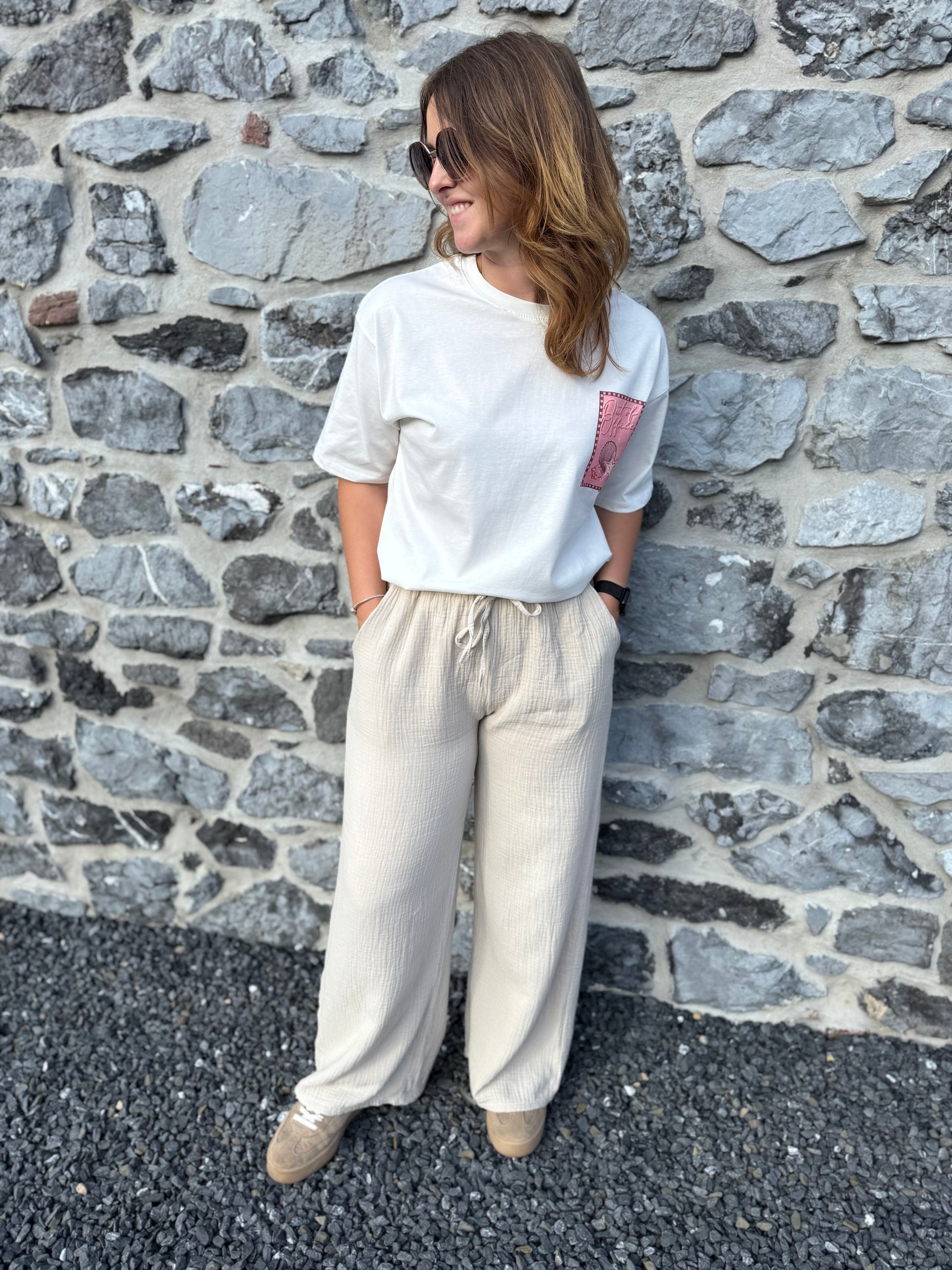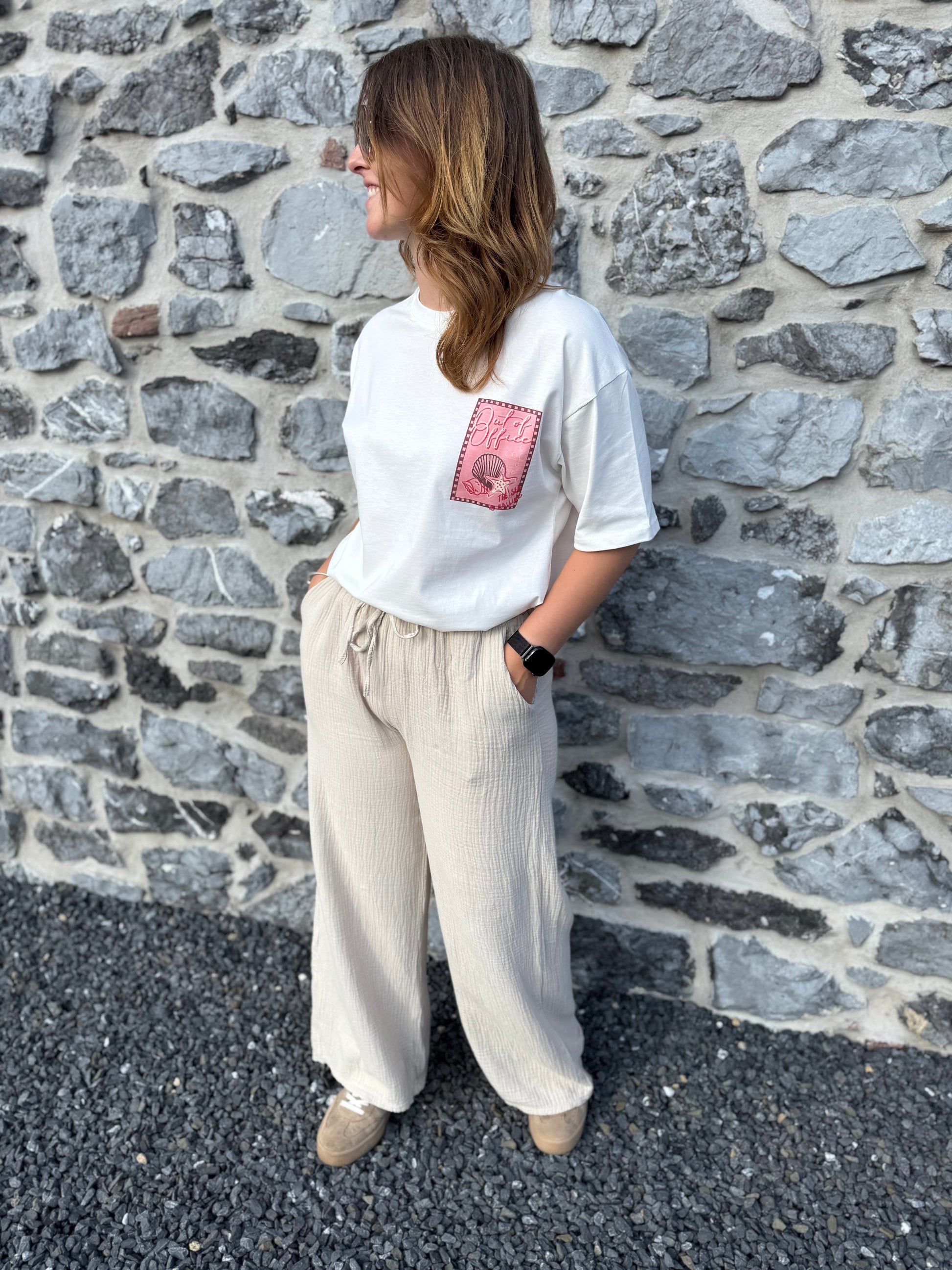 Le pantalon Victor beige est présenté avec le t-shirt Coquillage