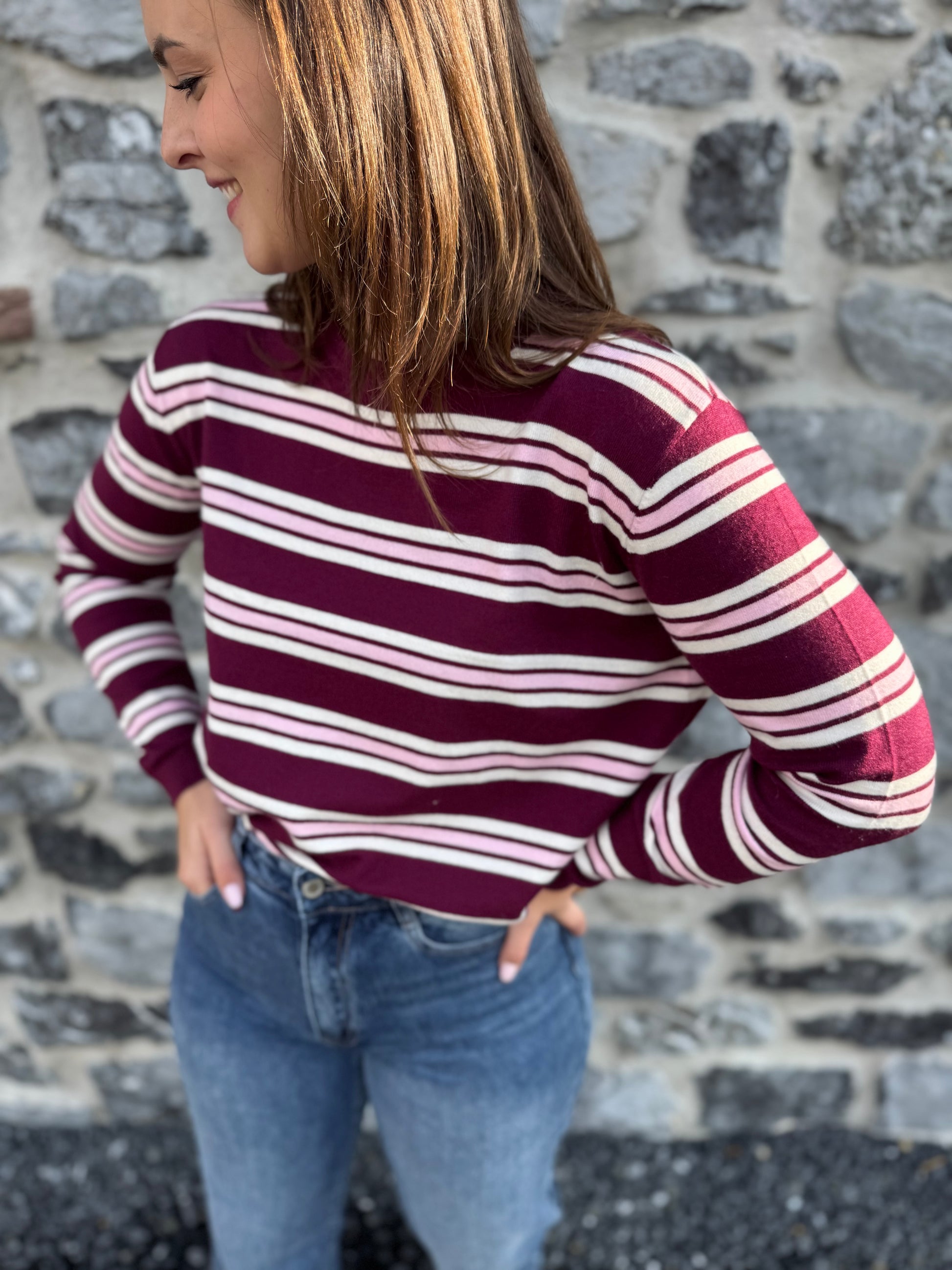 Le pull Davy bordeaux est présenté avec le jeans Diego
