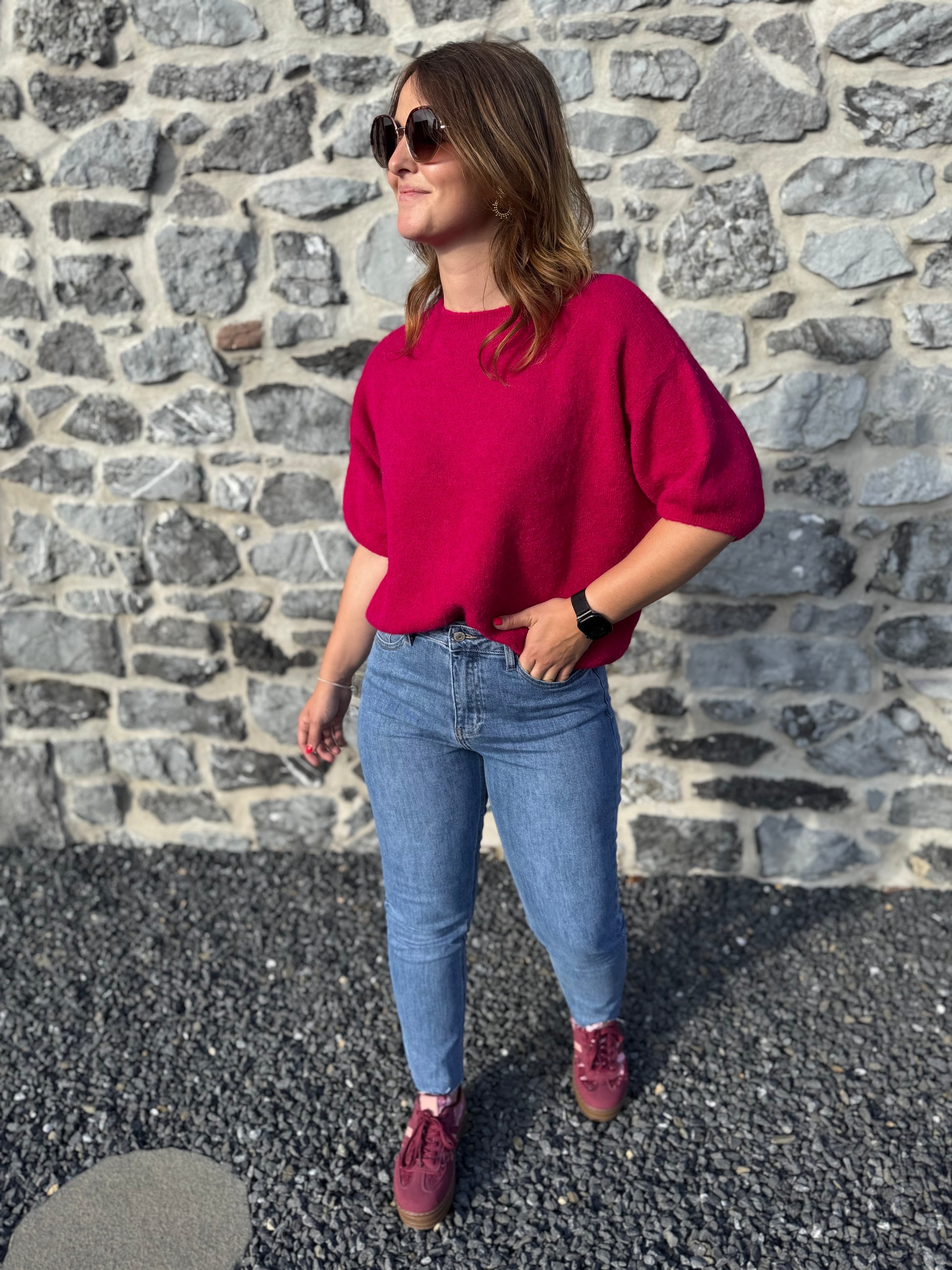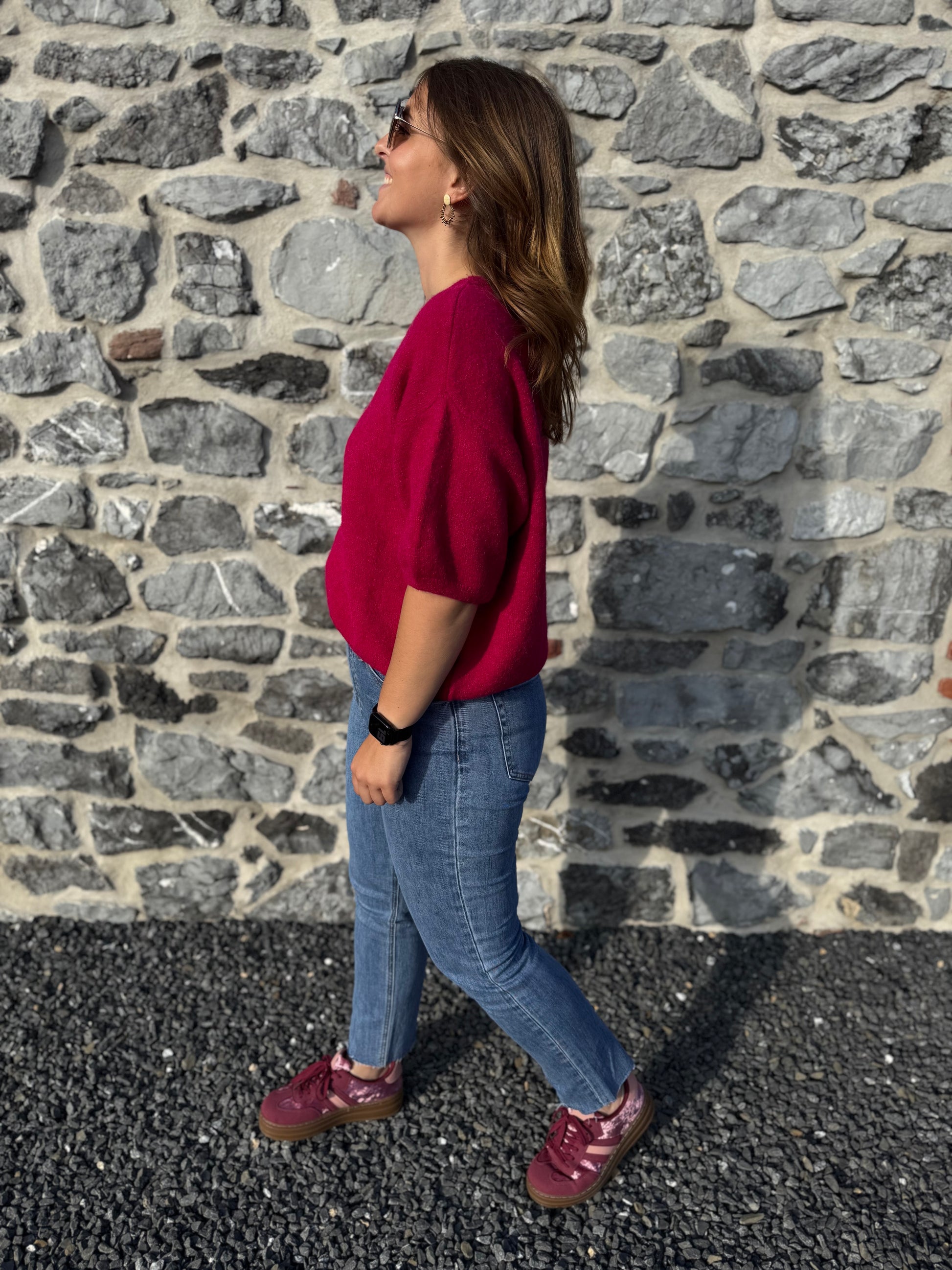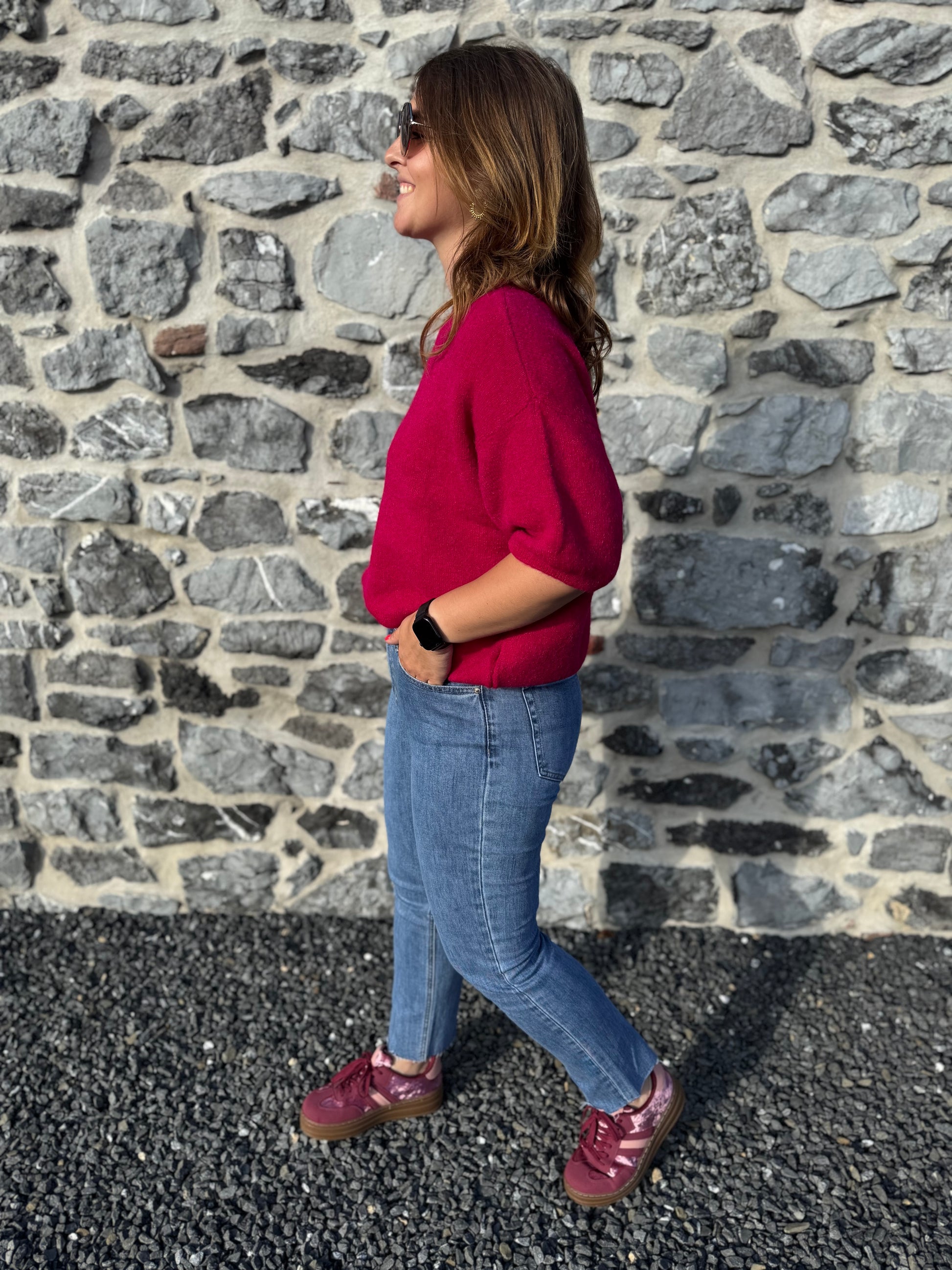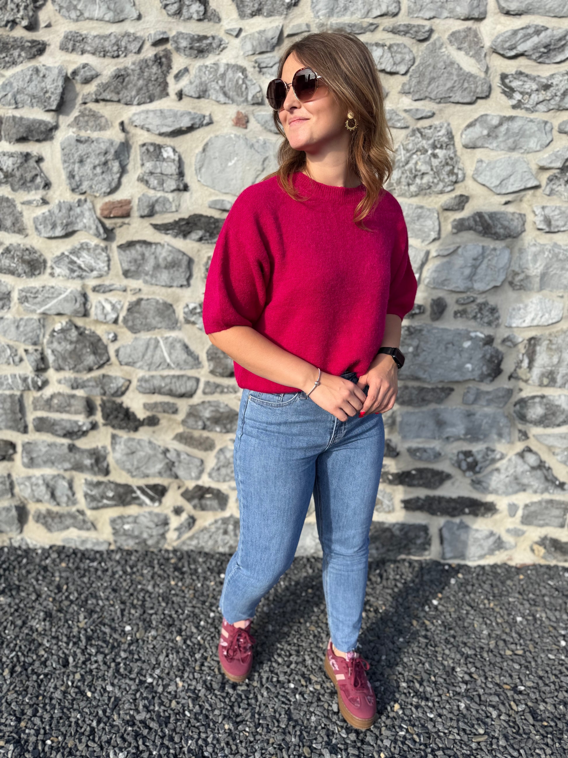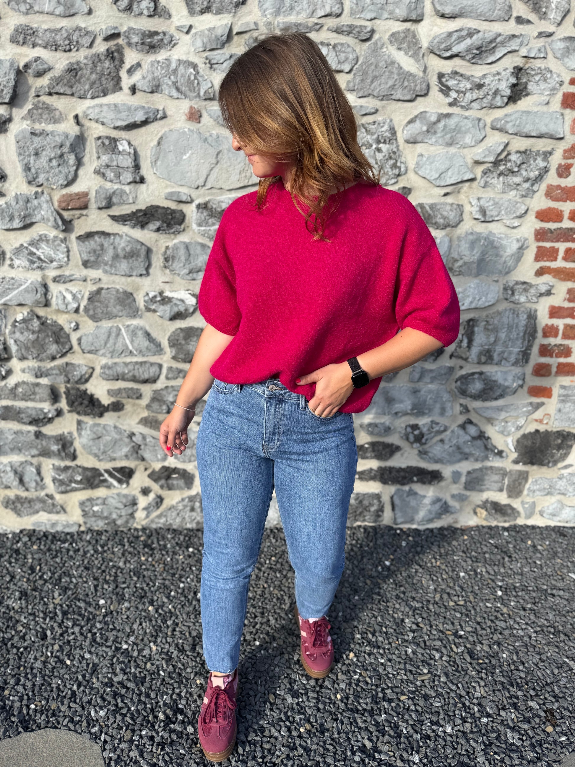 Le pull Livia est présenté avec le jeans Irina et les baskets Rosie