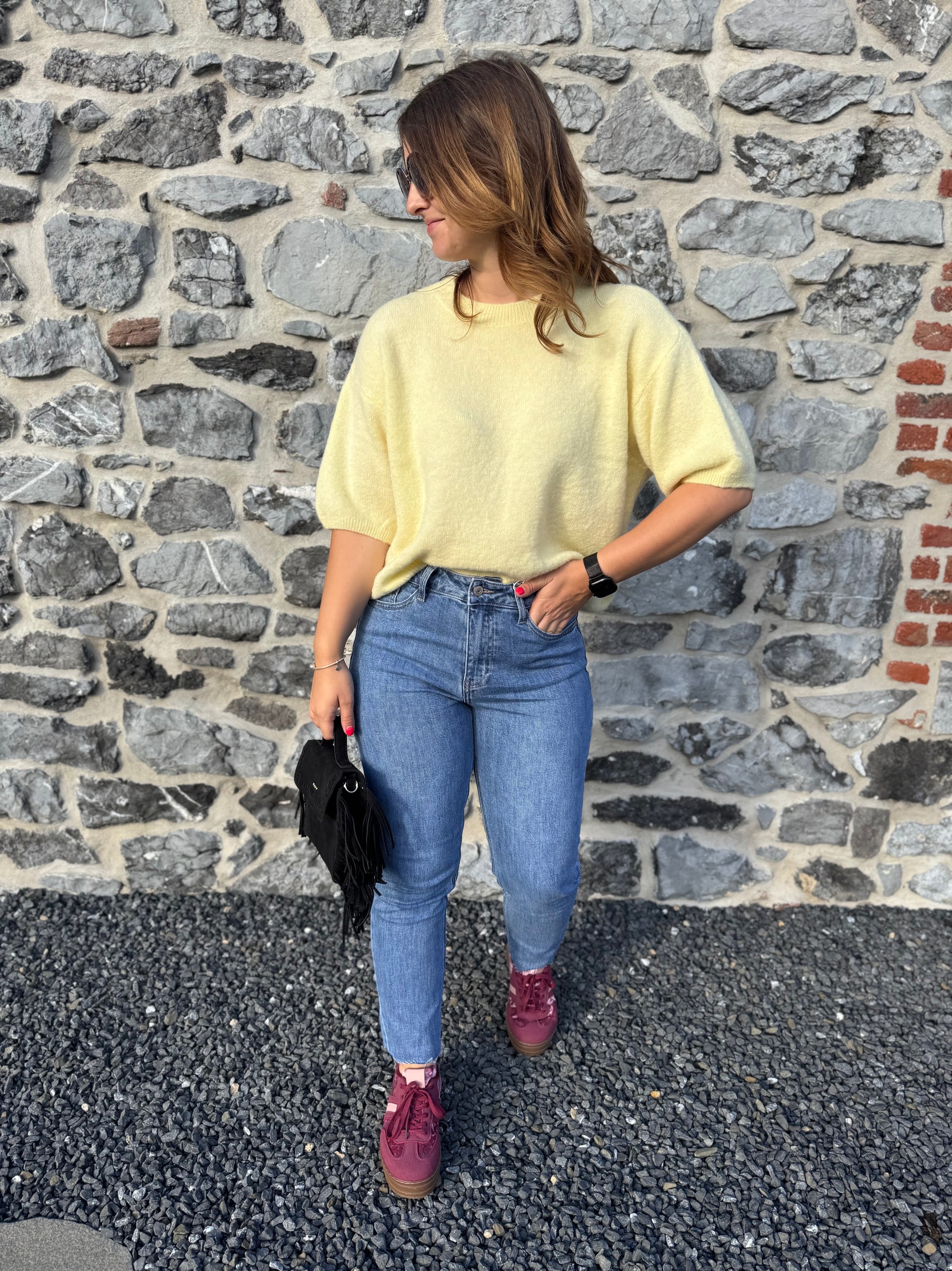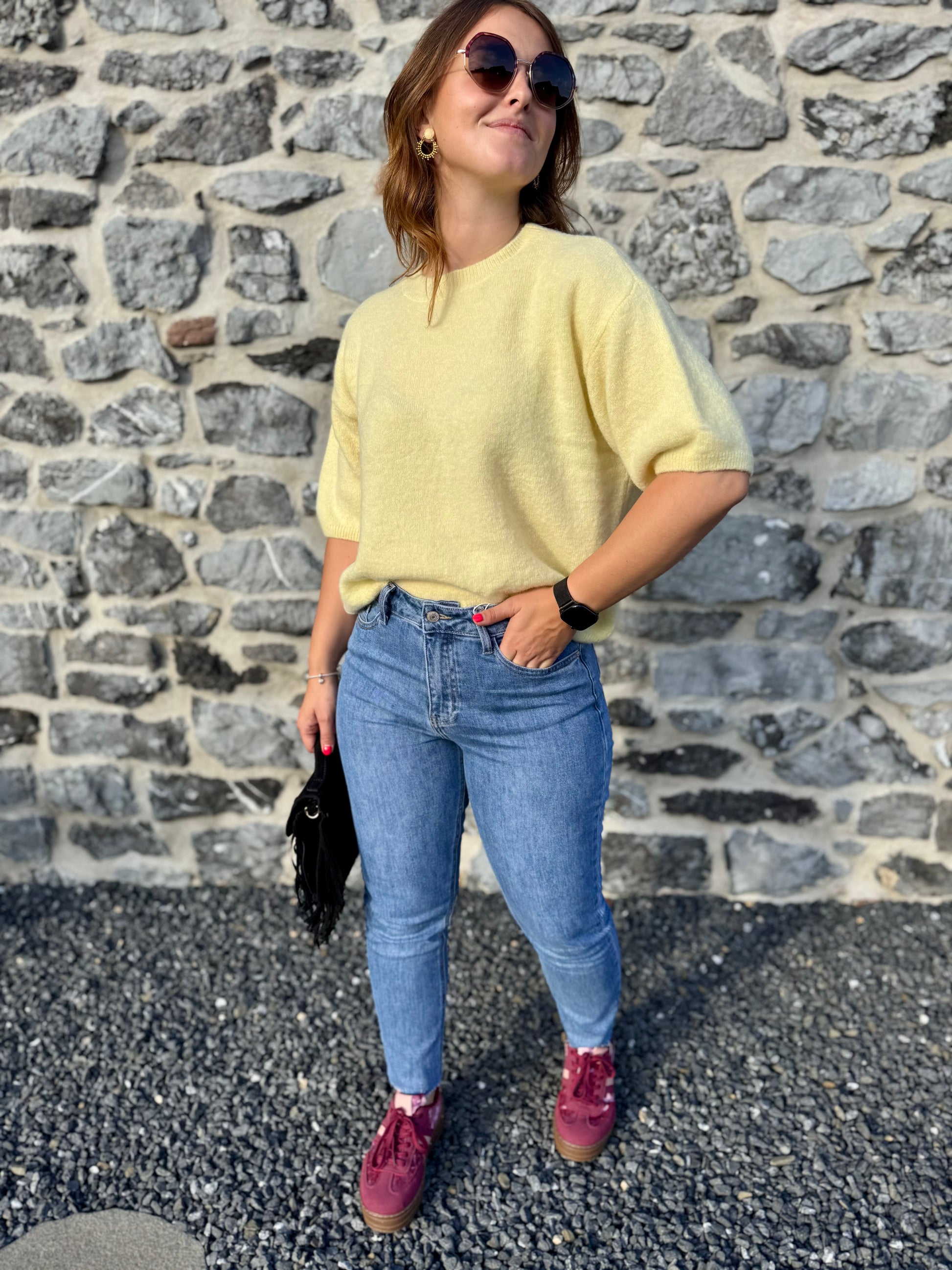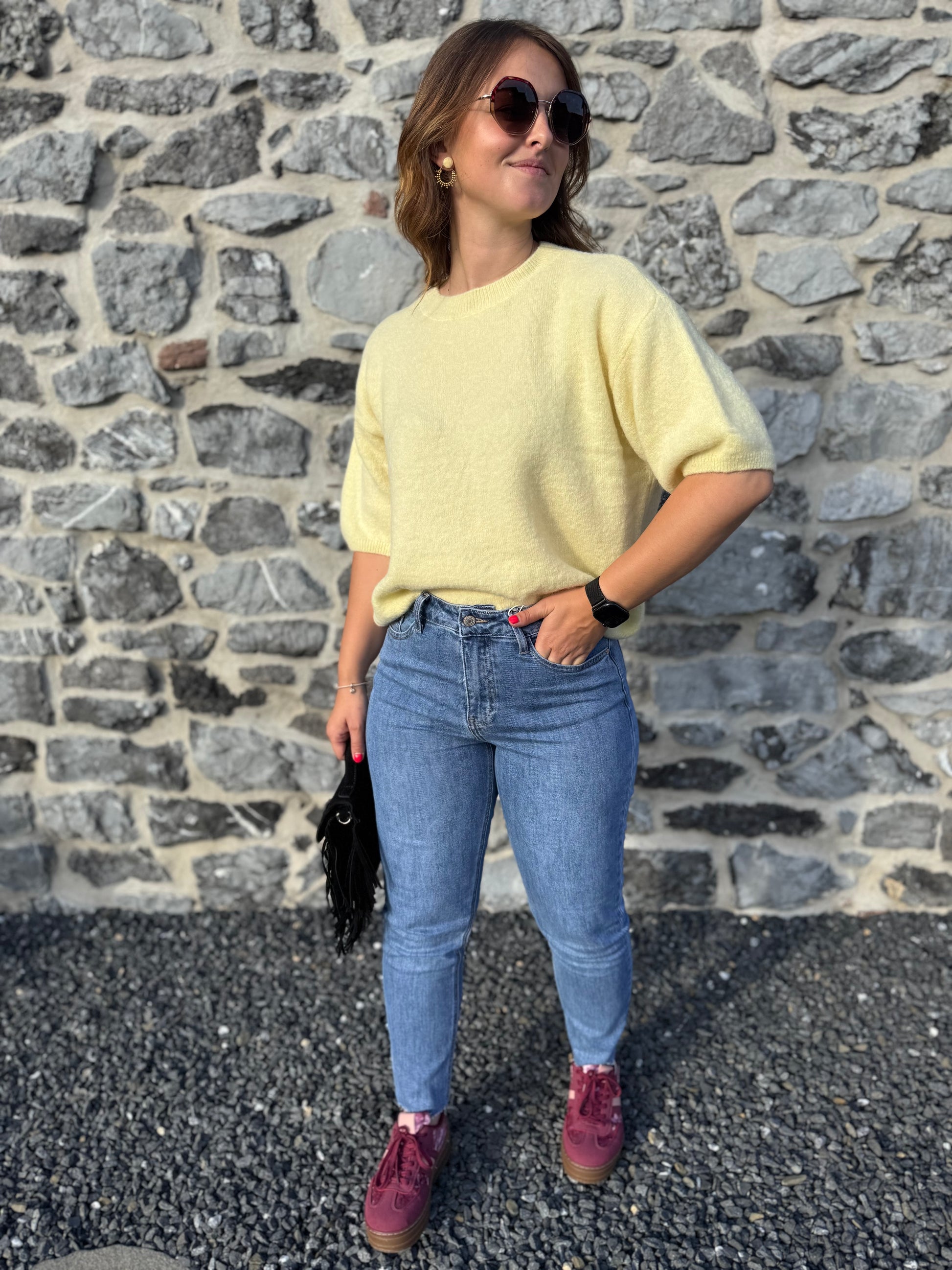 Le pull Livia est présenté avec le jeans Irina et les baskets Rosie
