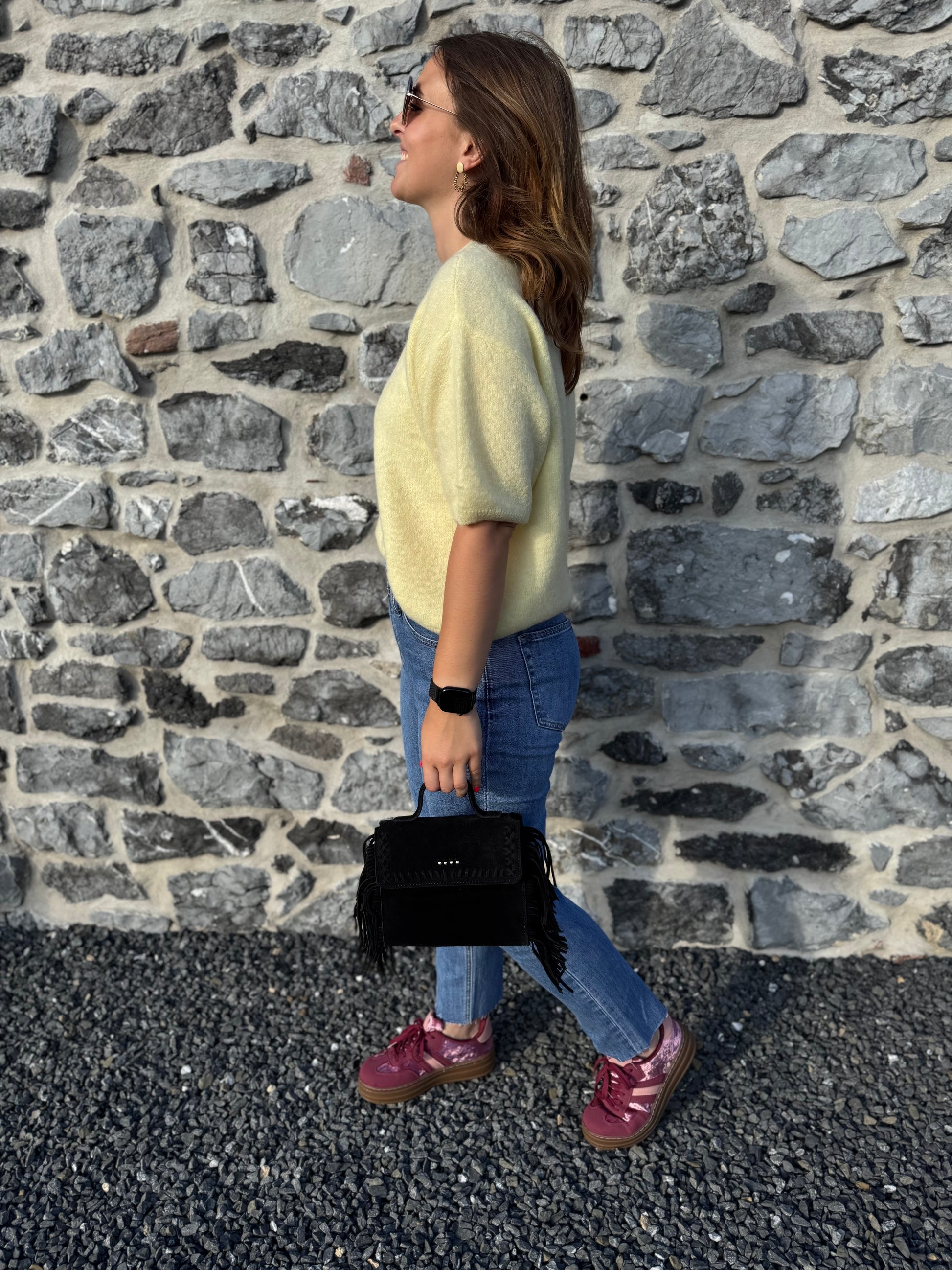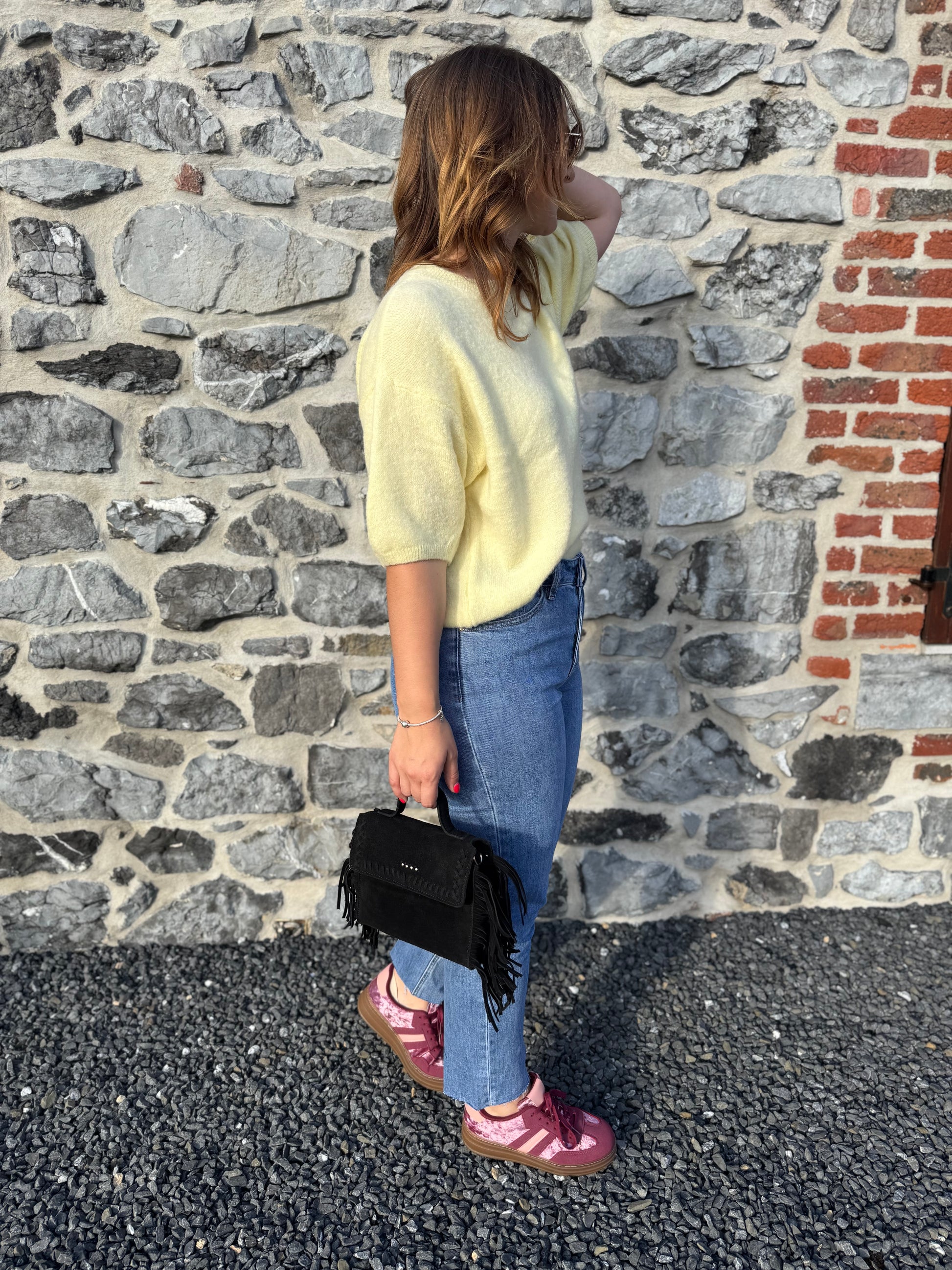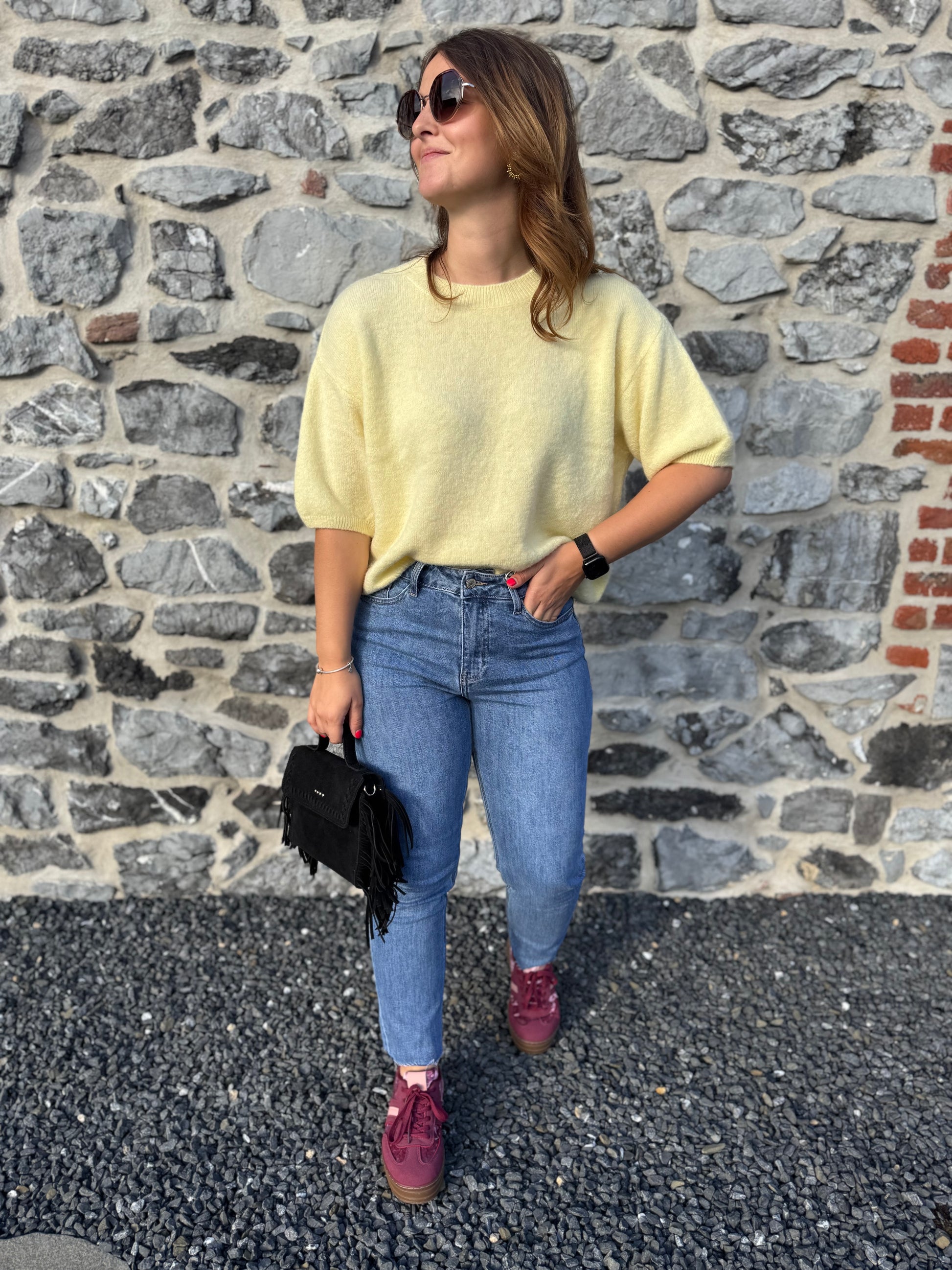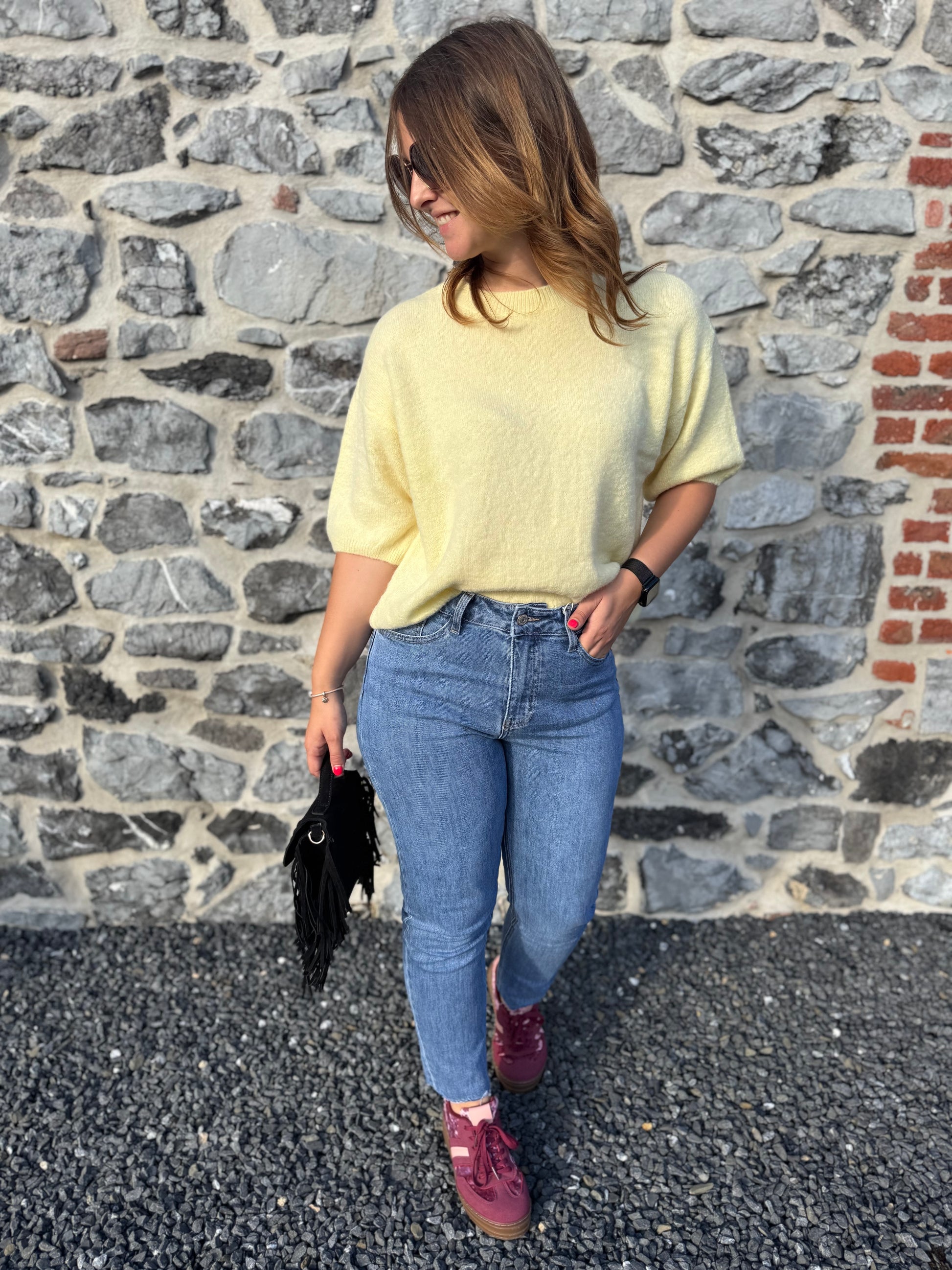 Le pull Livia est présenté avec le jeans Irina et les baskets Rosie