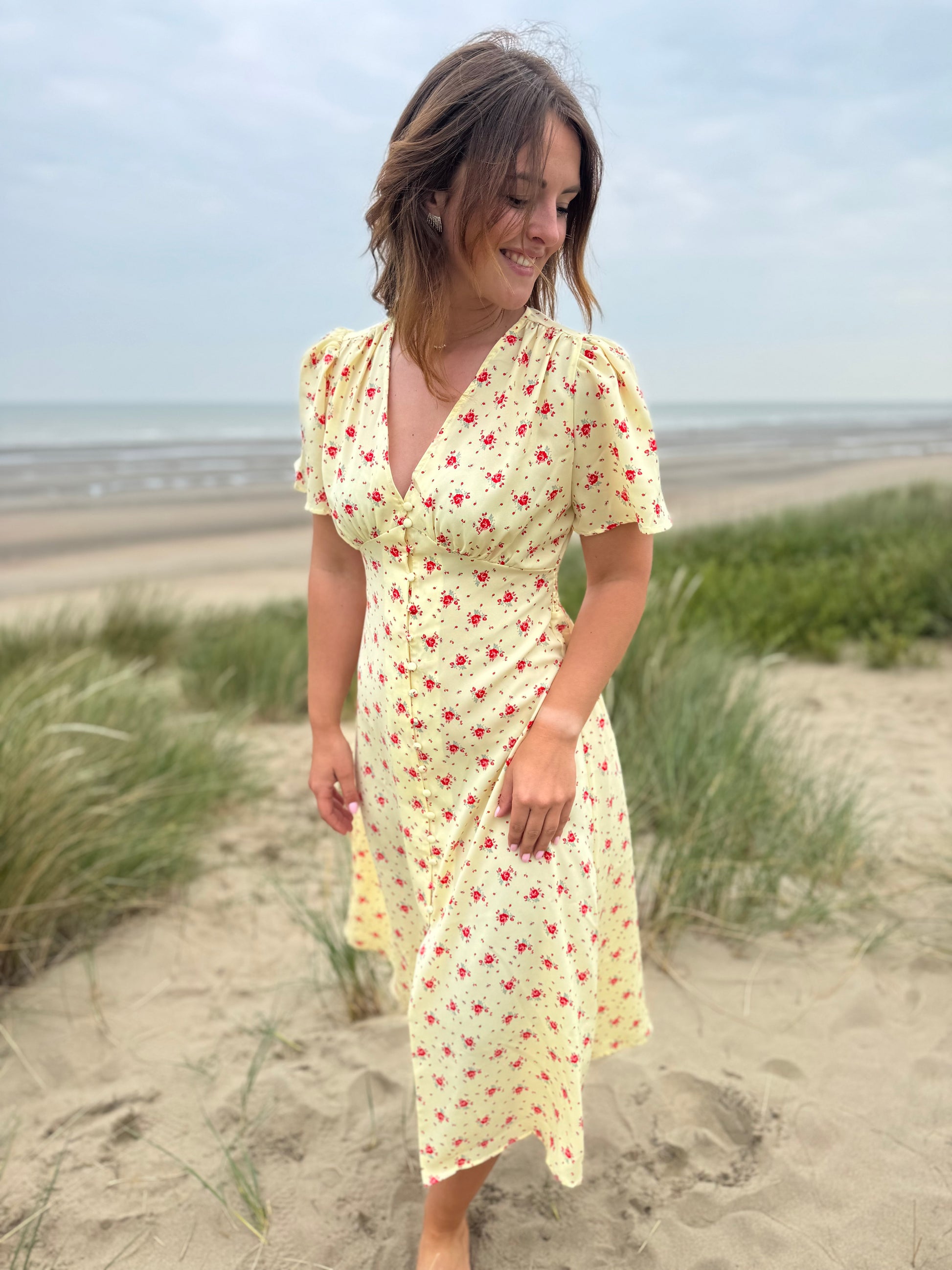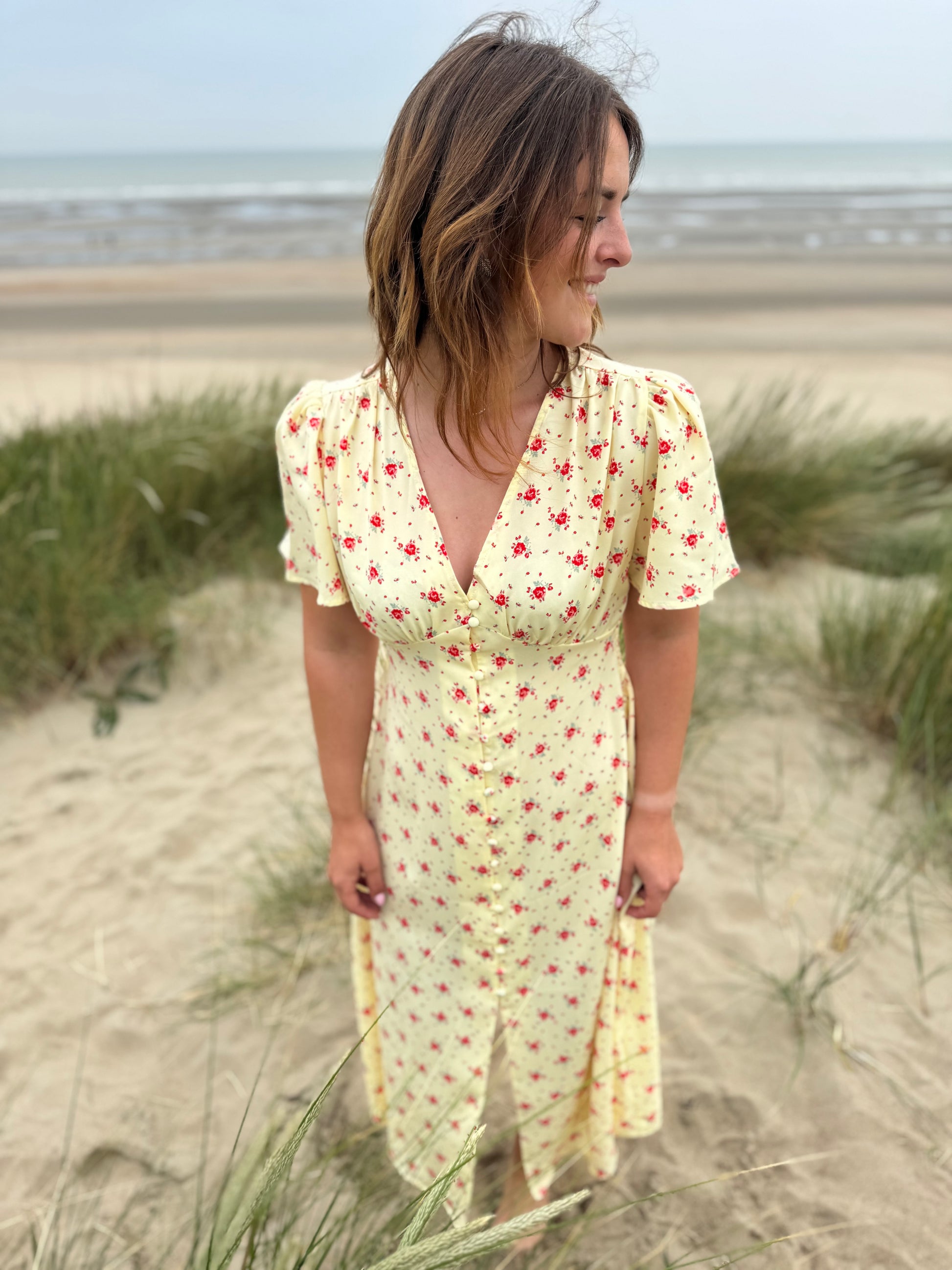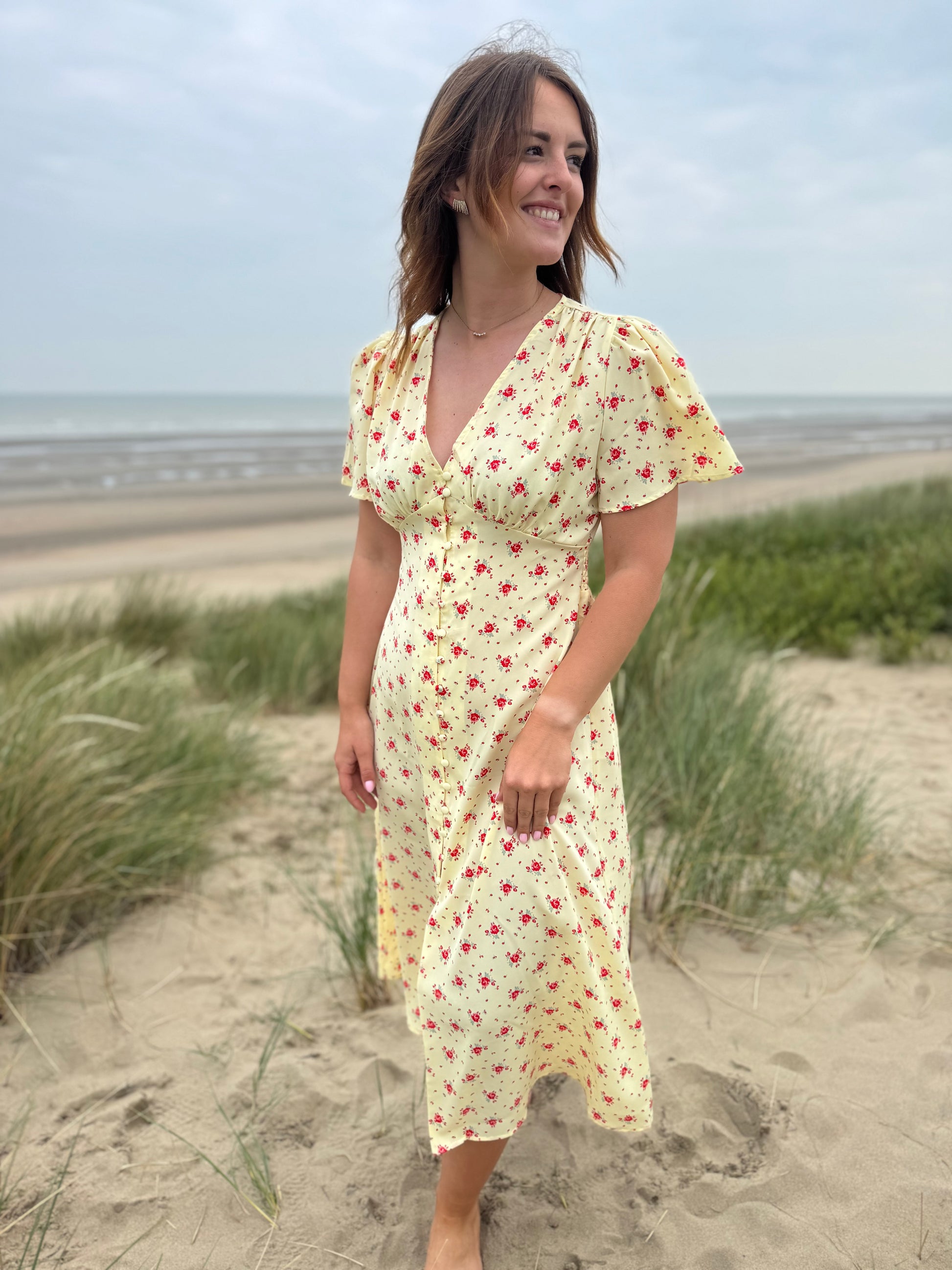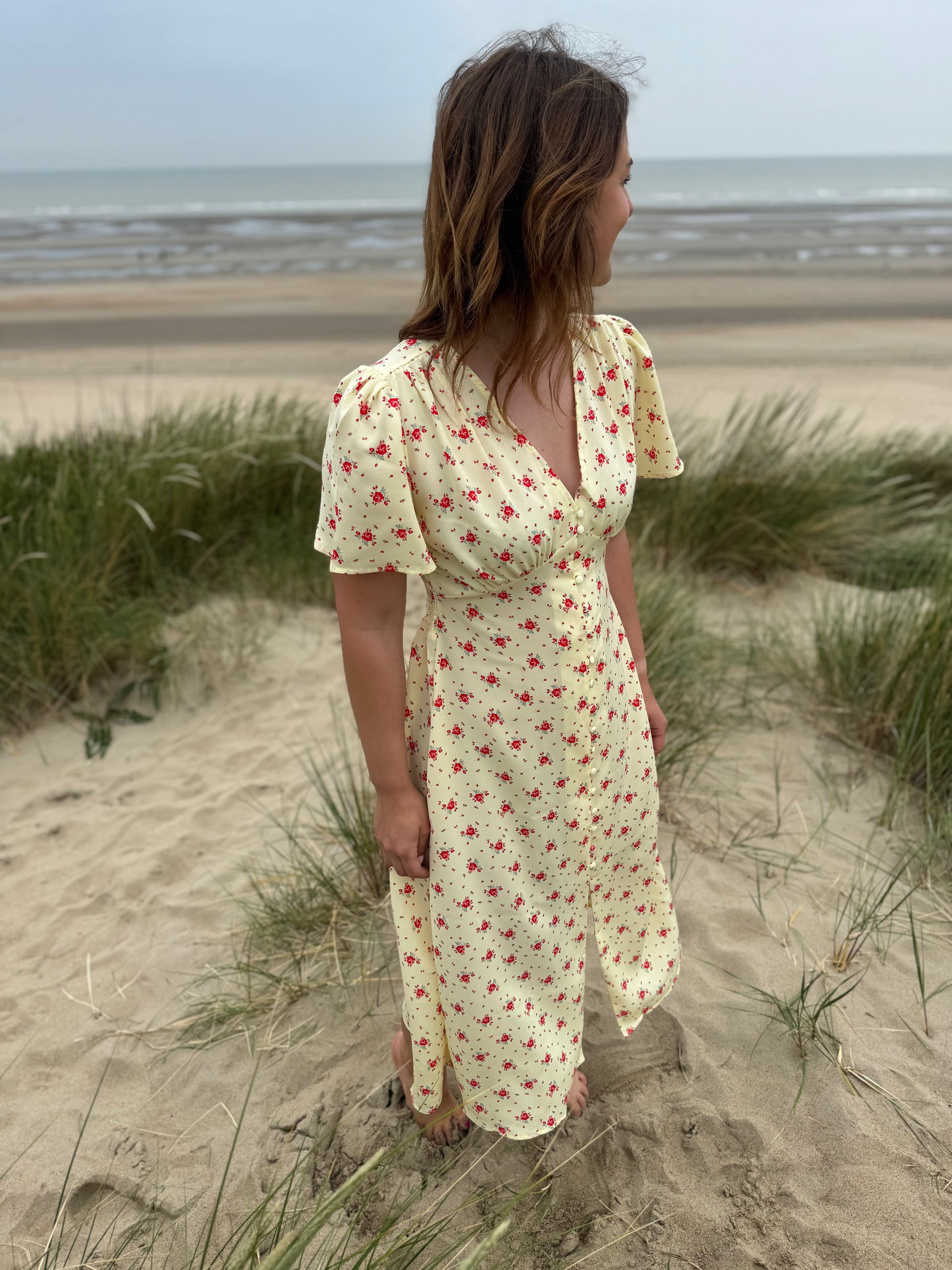 - Resserrée à la taille (élastique à l'arrière de la robe)
