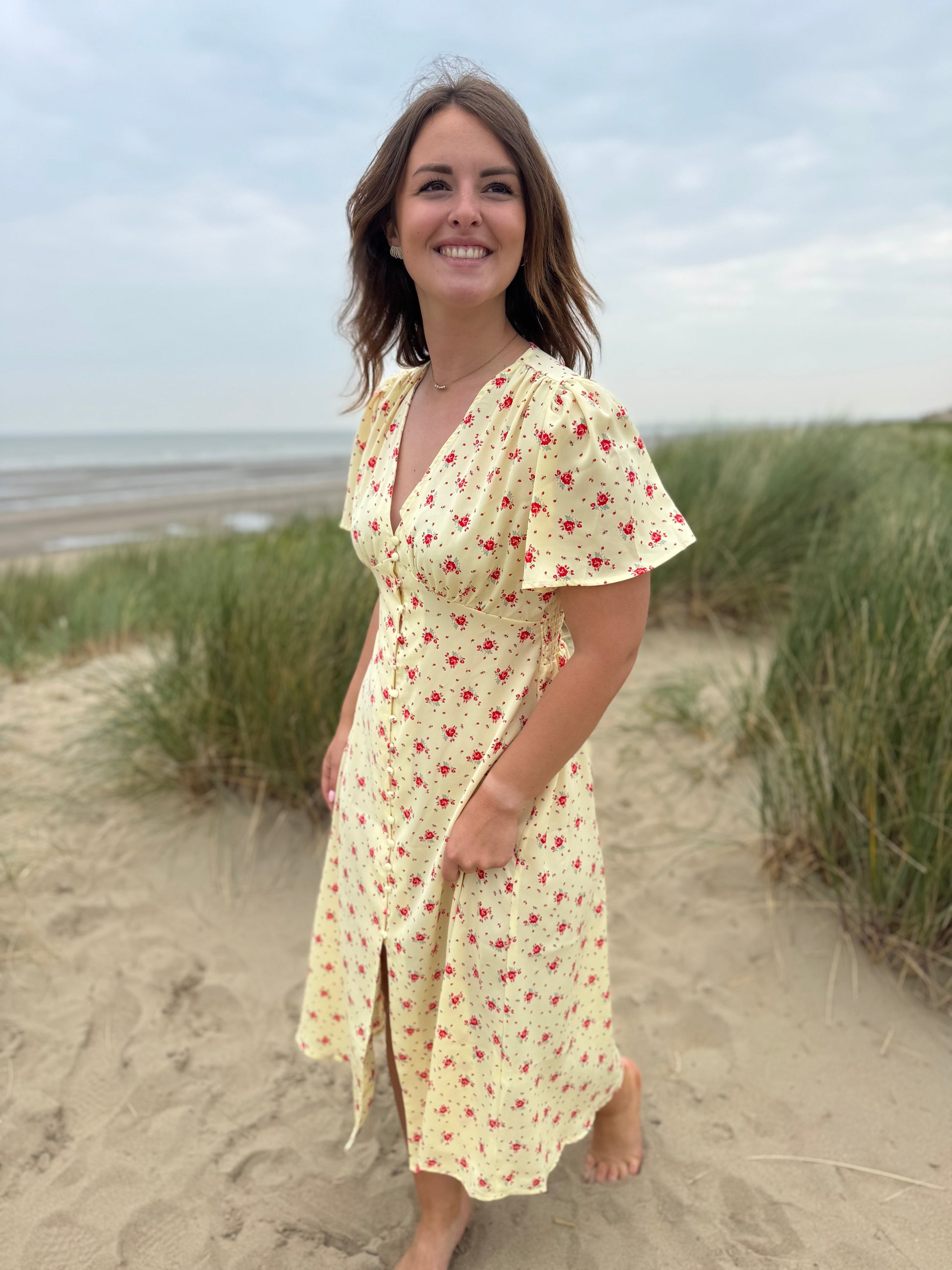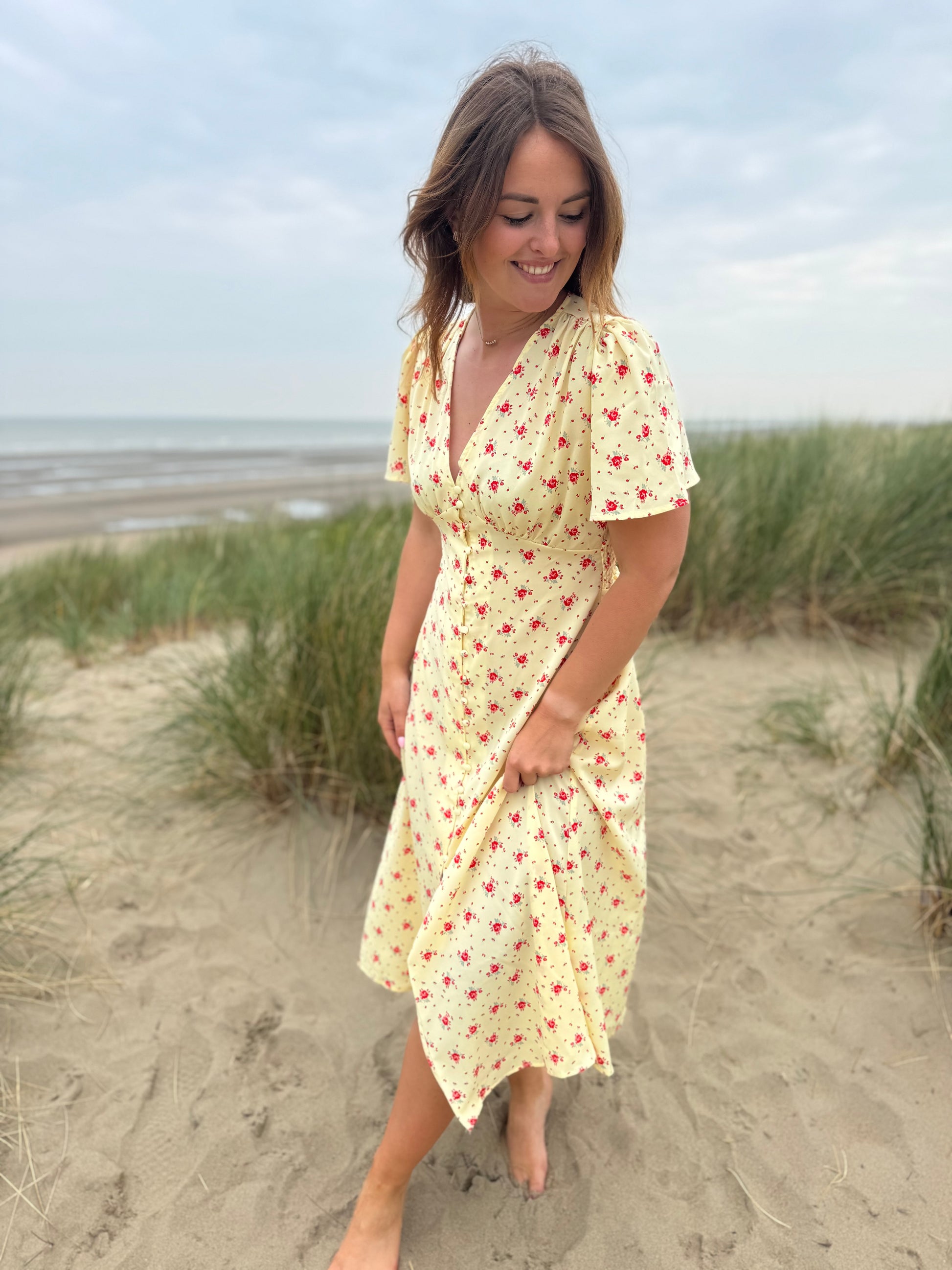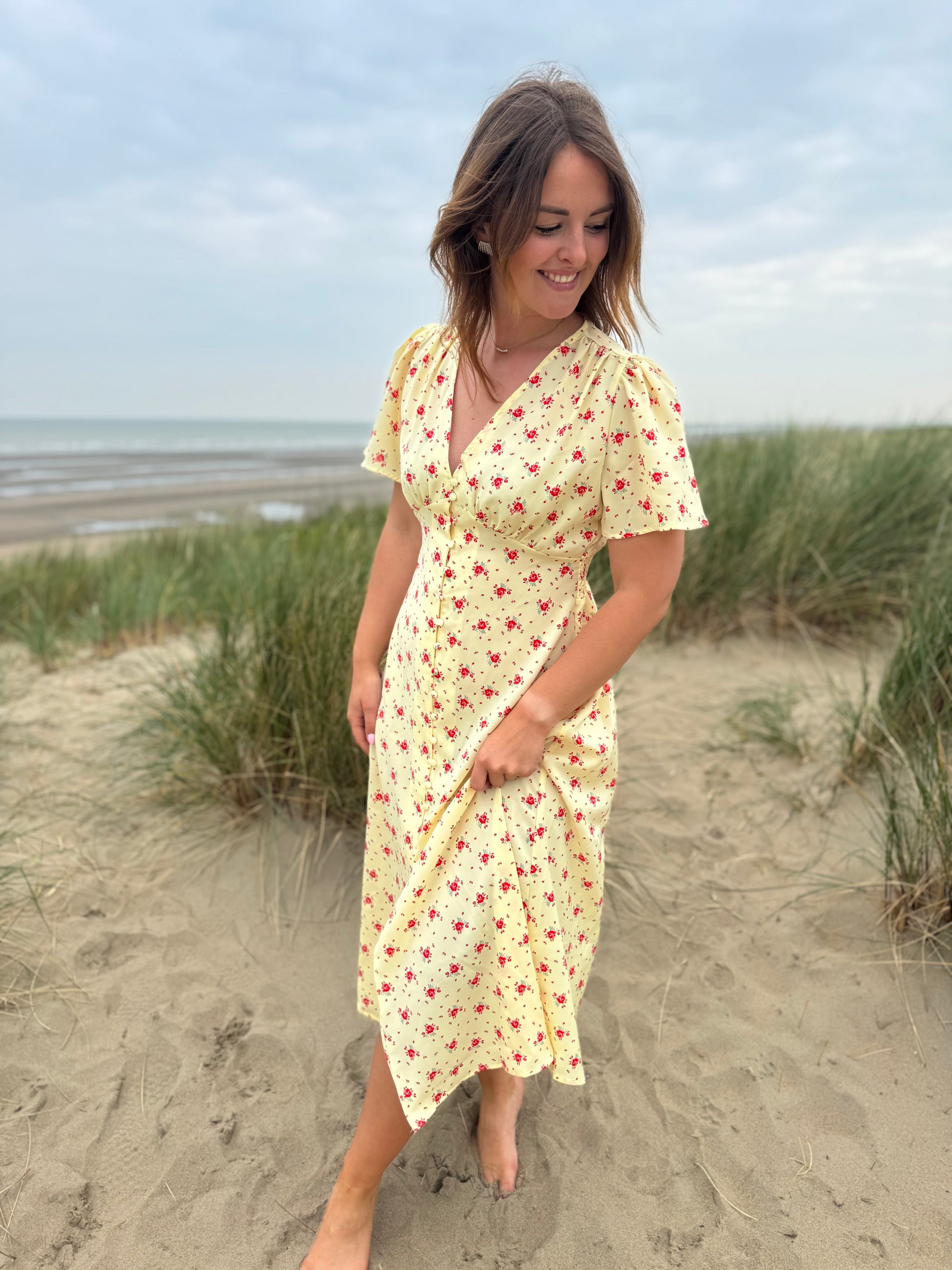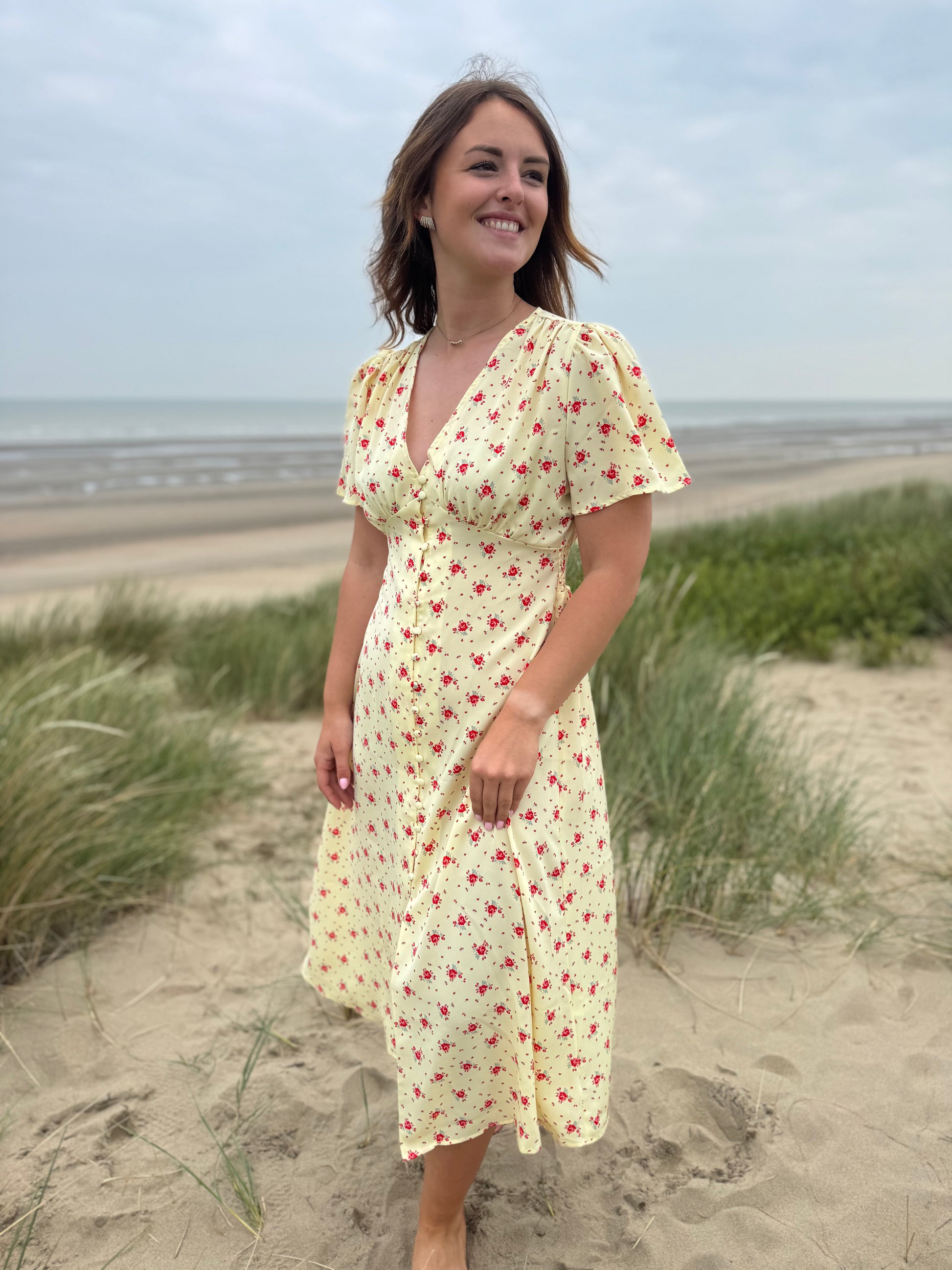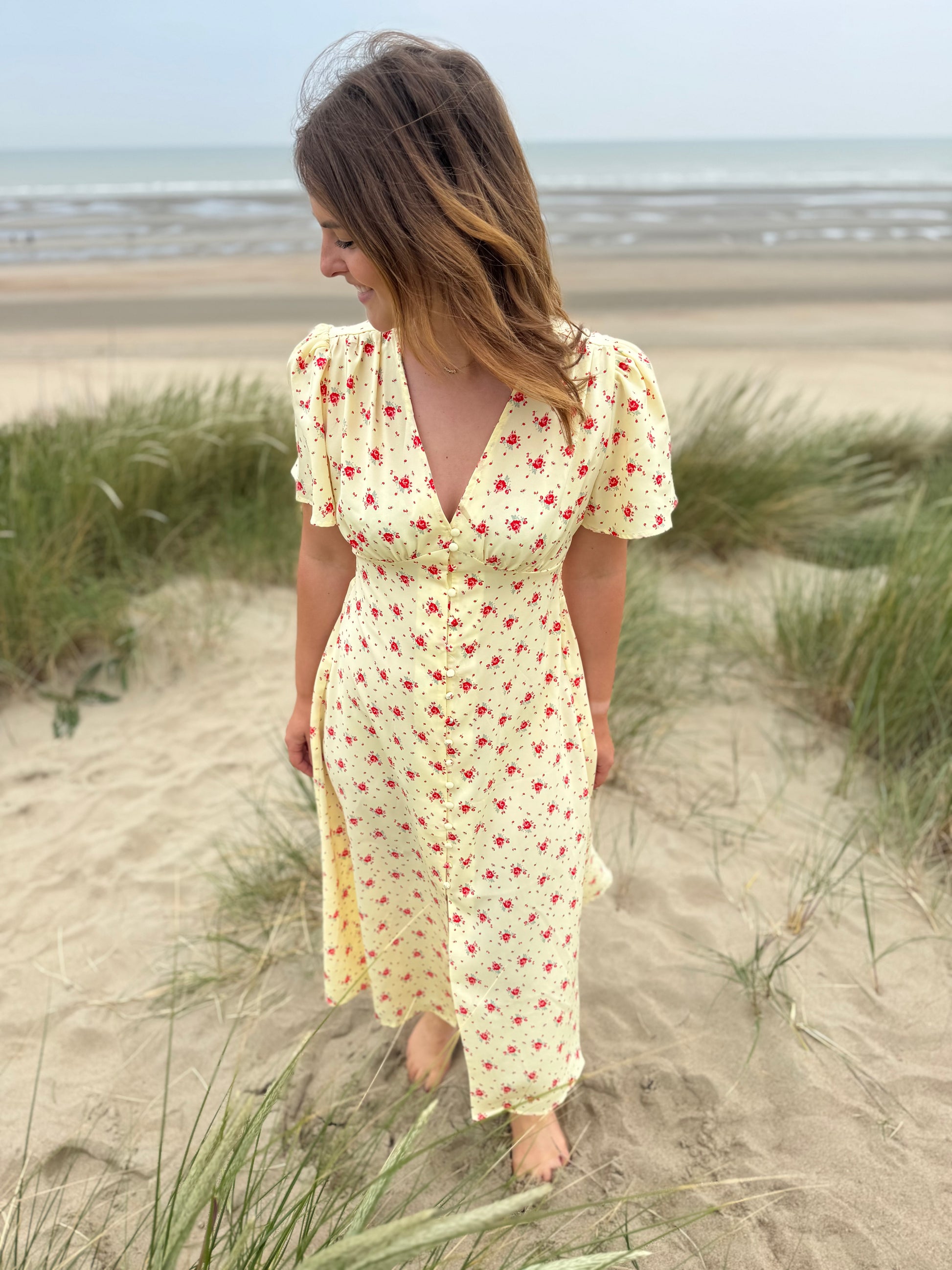 - Resserrée à la taille (élastique à l'arrière de la robe)