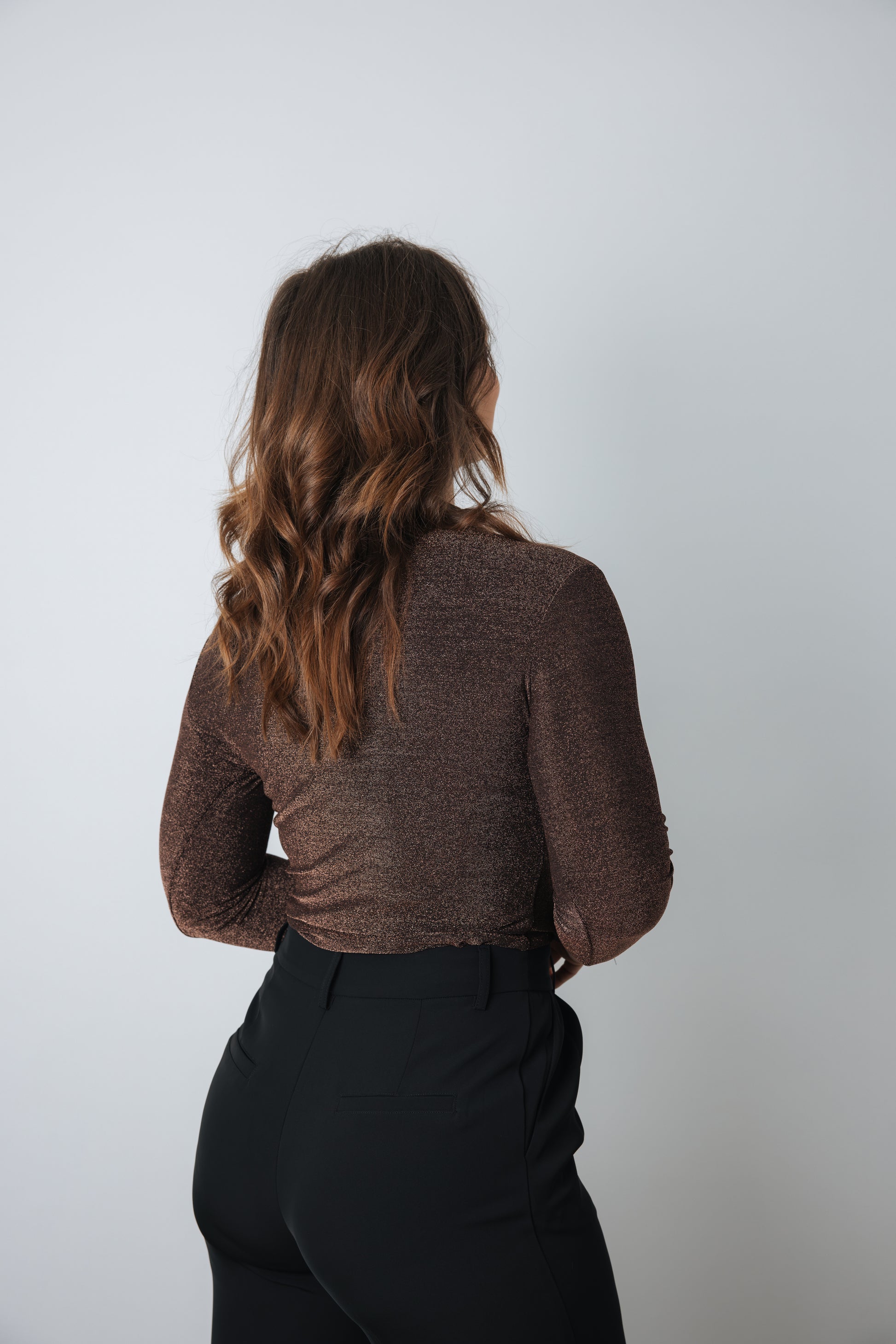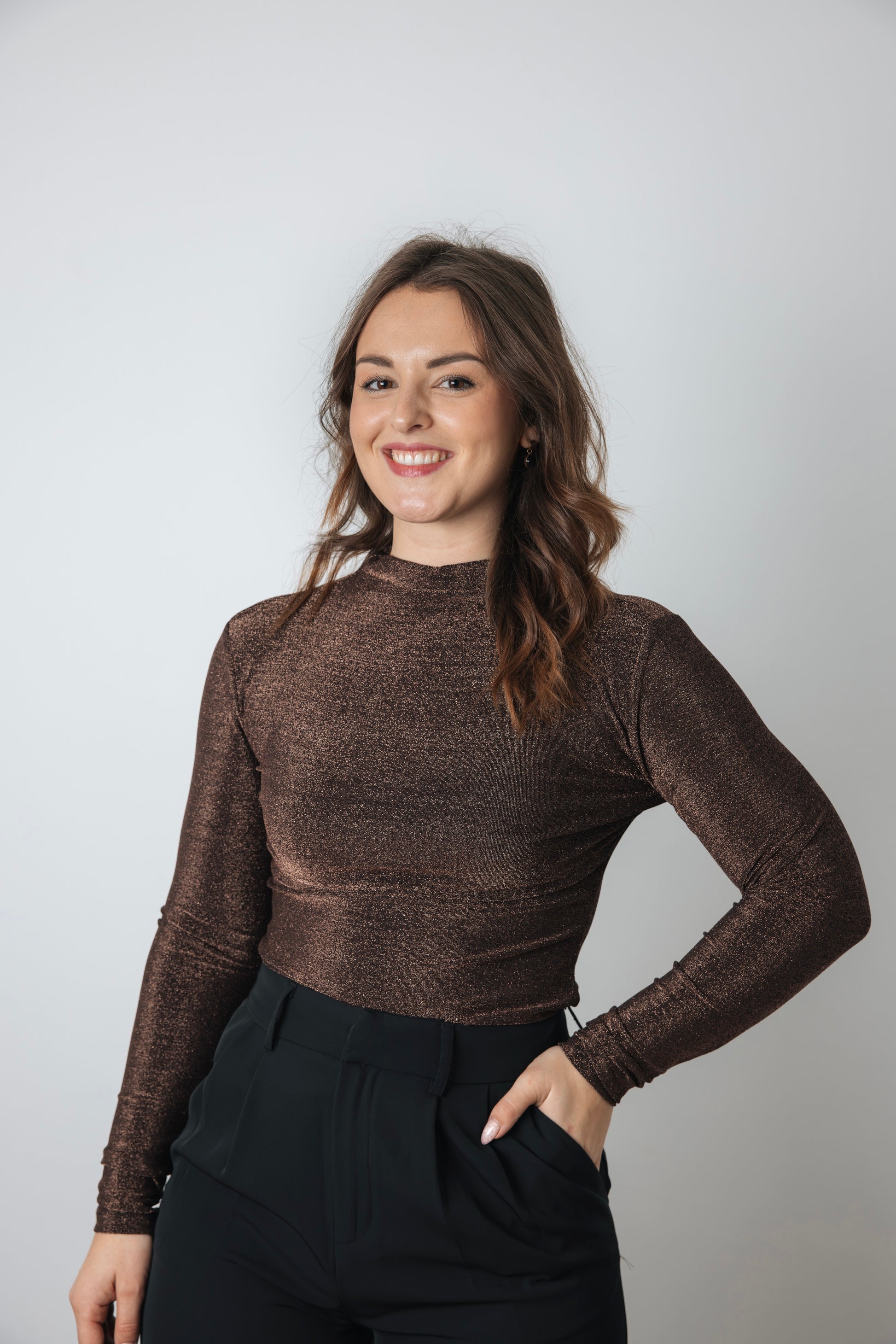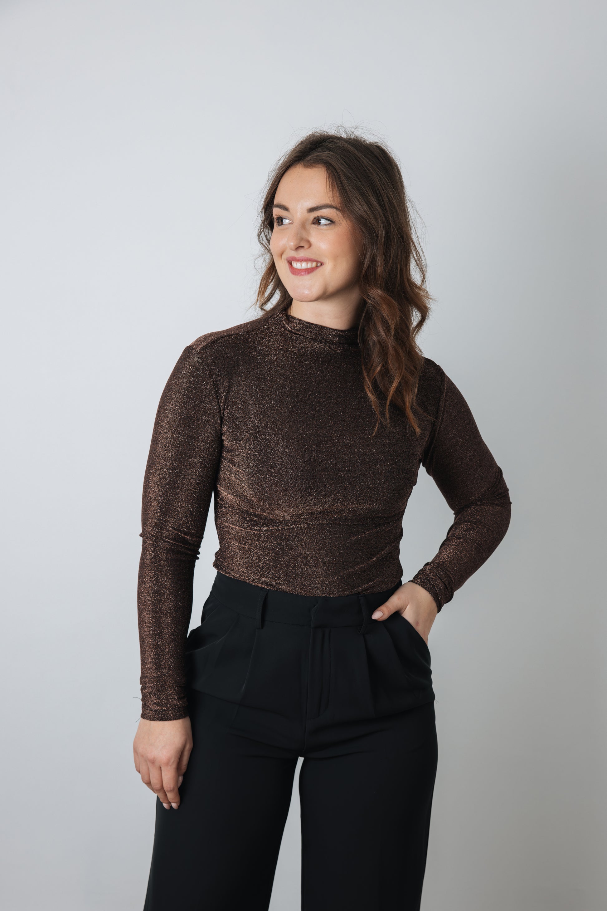 On craque pour sa matière pailletée extensible, confortable et pleine d'éclat. Avec son col légèrement montant et sa coupe près du corps, il met en valeur la silhouette tout en restant facile à porter.